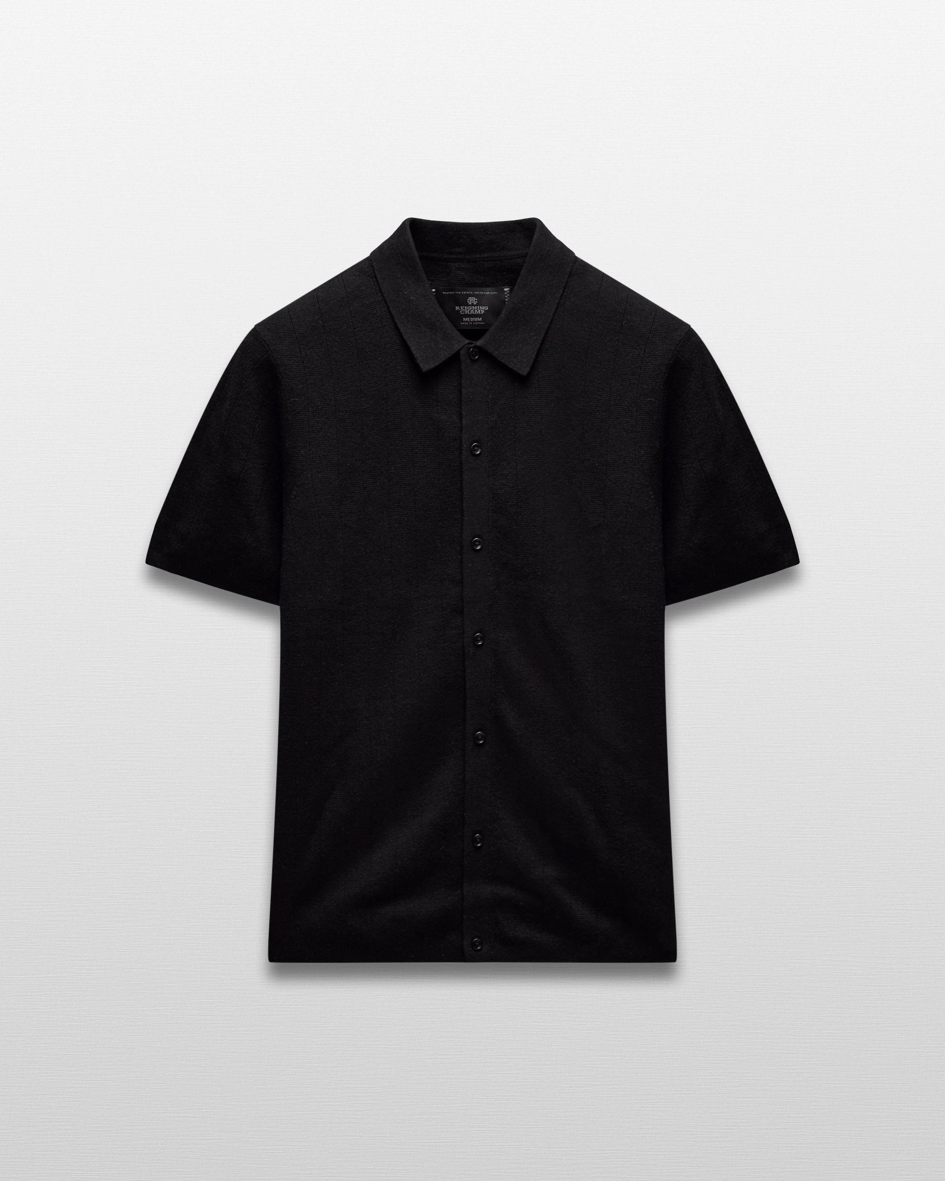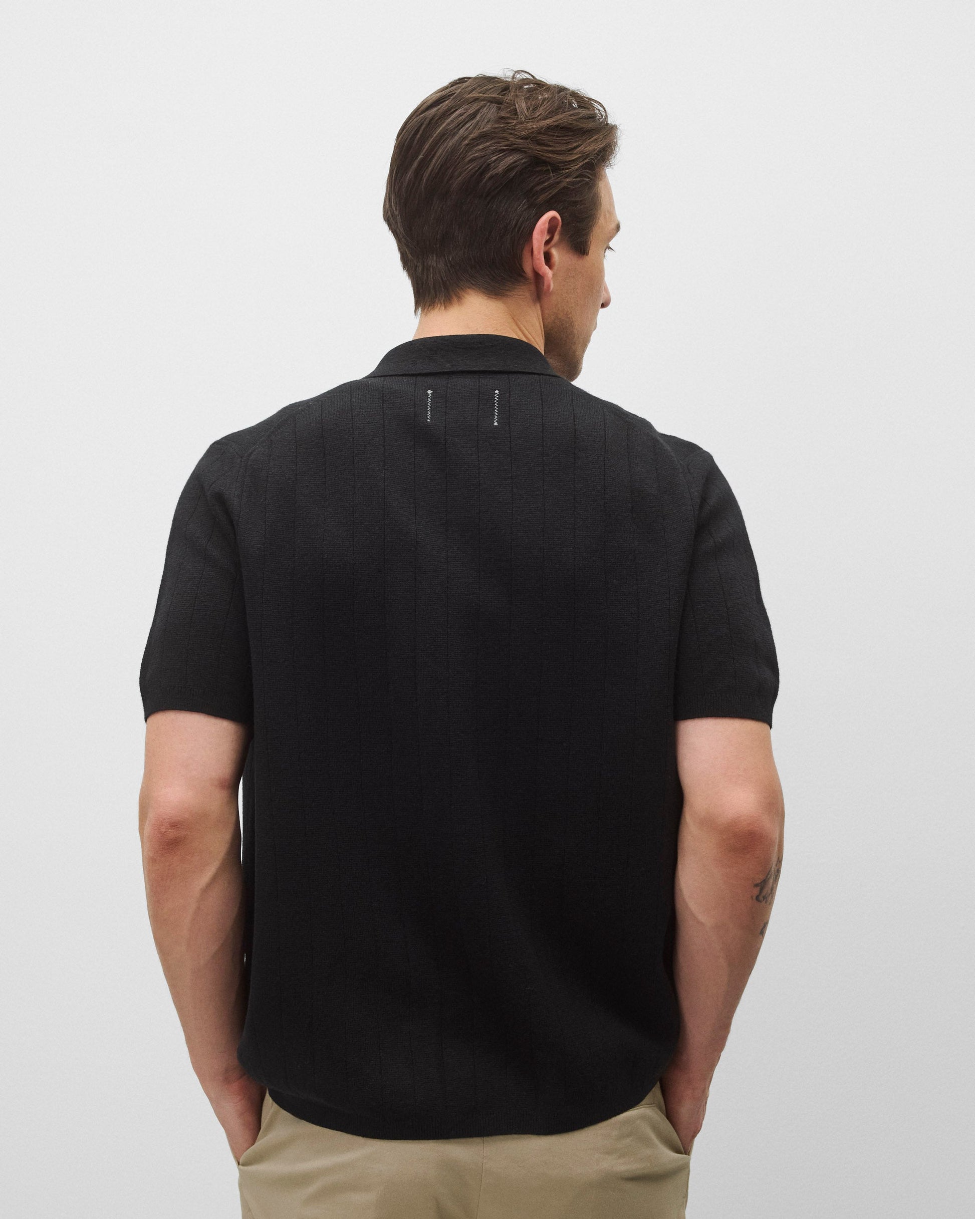 This short sleeve knit shirt is crafted from a breathable cotton-linen blend with the softest touch. Featuring a standard fit with fully fashioned seams. Designed with a half-milano stitch collar and placket, tonal logo buttons, and lycra-bound cuffs and hem.