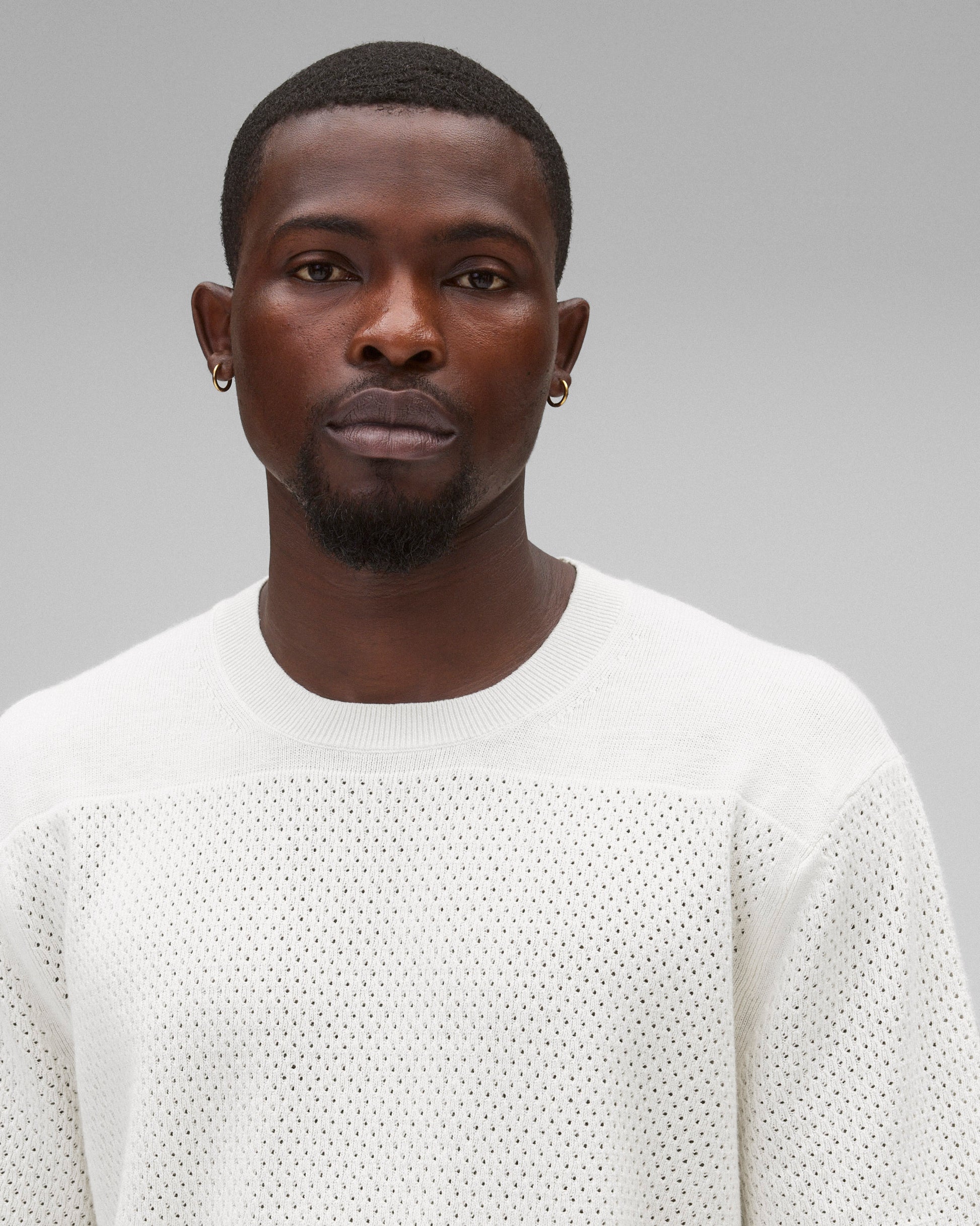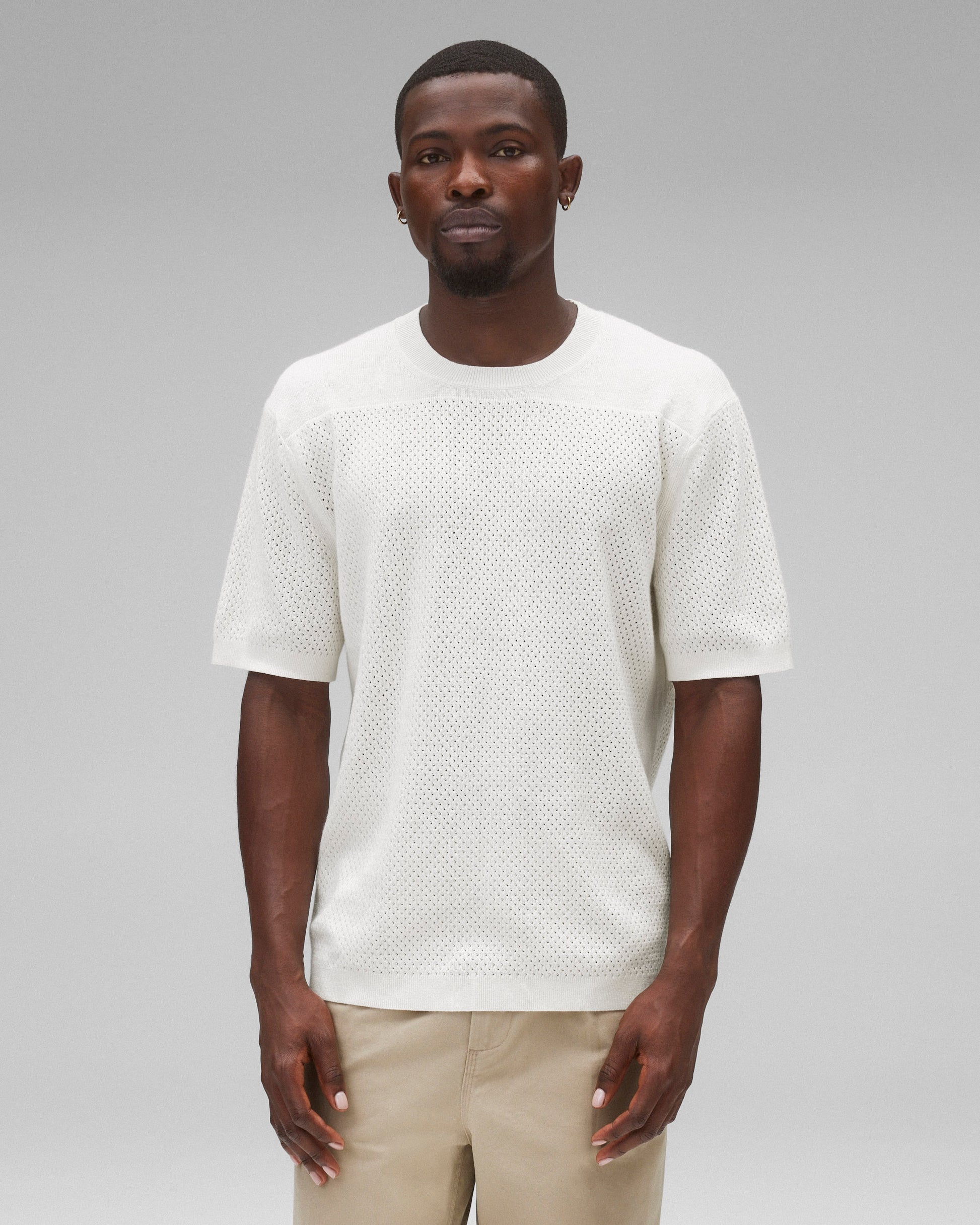 This mesh knit short sleeve is crafted from a breathable cotton-linen blend with a soft touch. Featuring a relaxed fit, with contrasting stitch panels. Designed with fine jersey stitch at the shoulder, open stitch body and sleeves, full needle side gussets, and rib collar, cuffs, and hem.