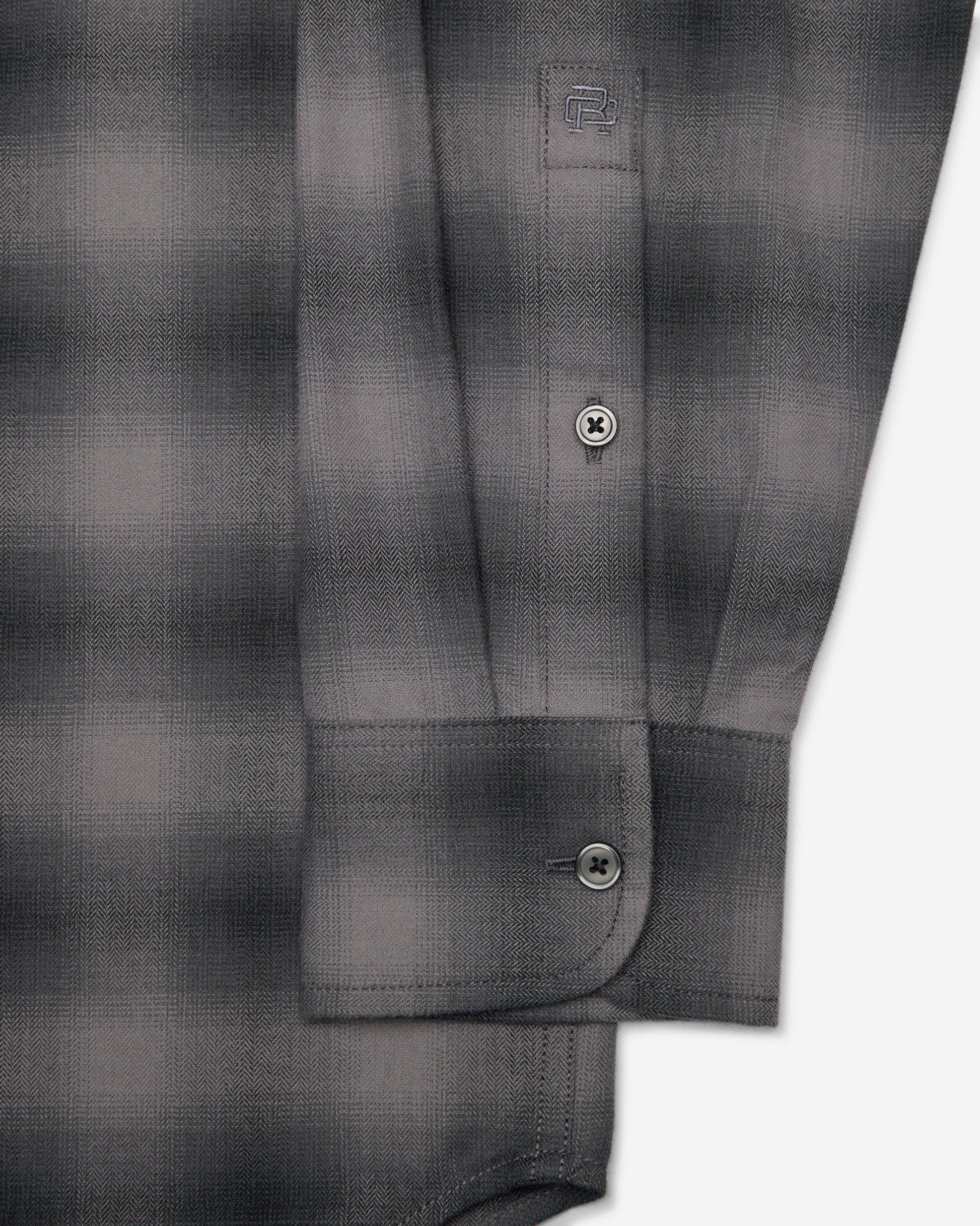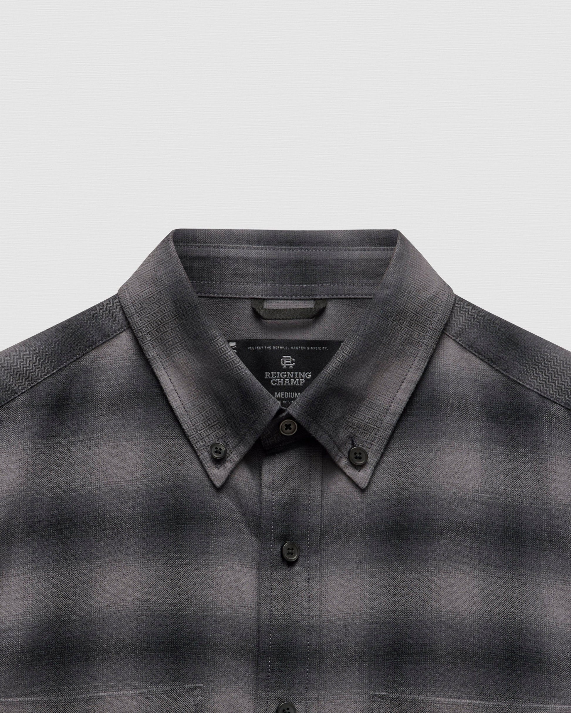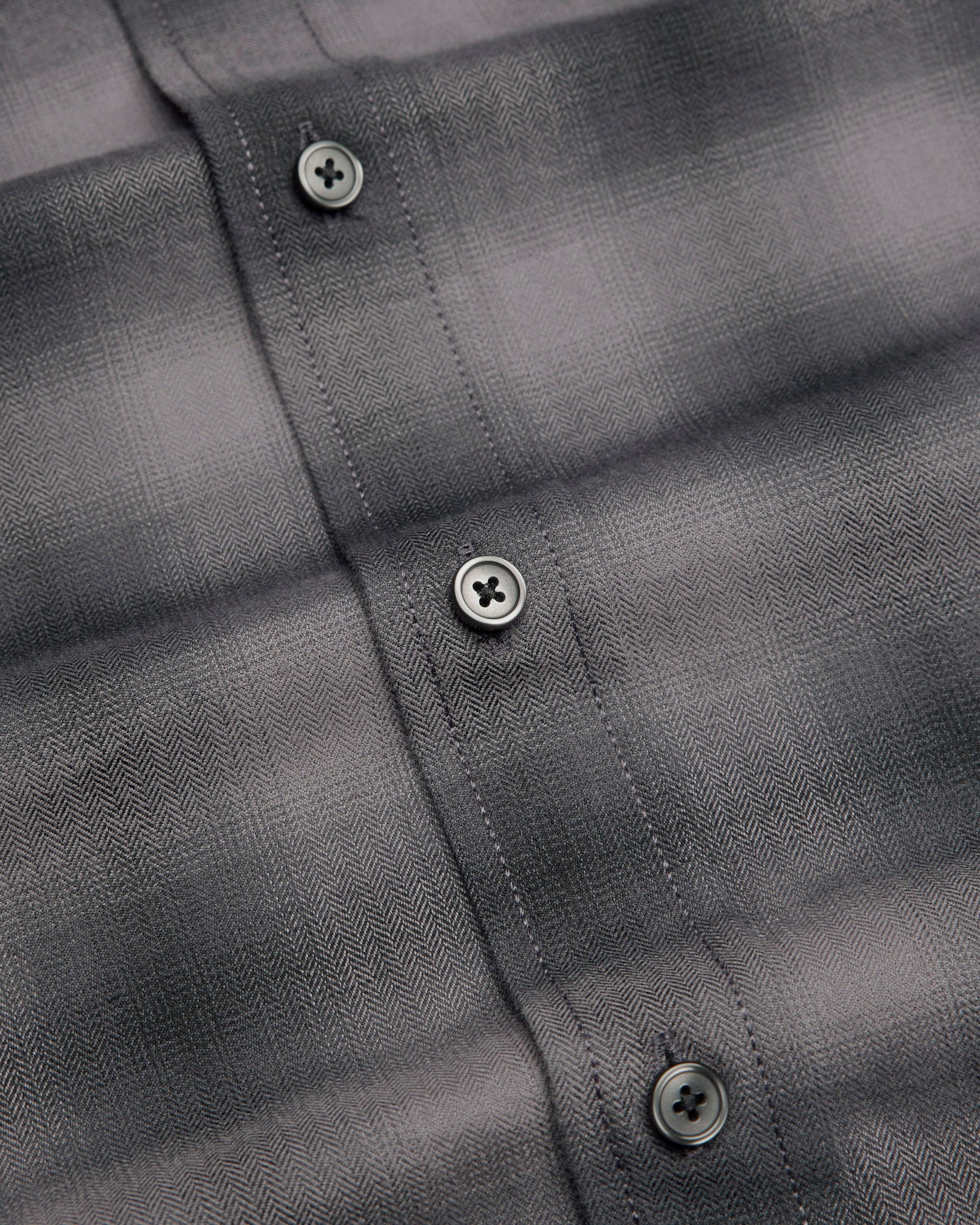 This shadow plaid button down shirt is crafted from a yarn-dyed cotton twill with structure and a soft finish. Designed in a boxy standard fit, with a pointed collar, chest pockets, corozo logo buttons, single button cuffs, and a scooped hem.