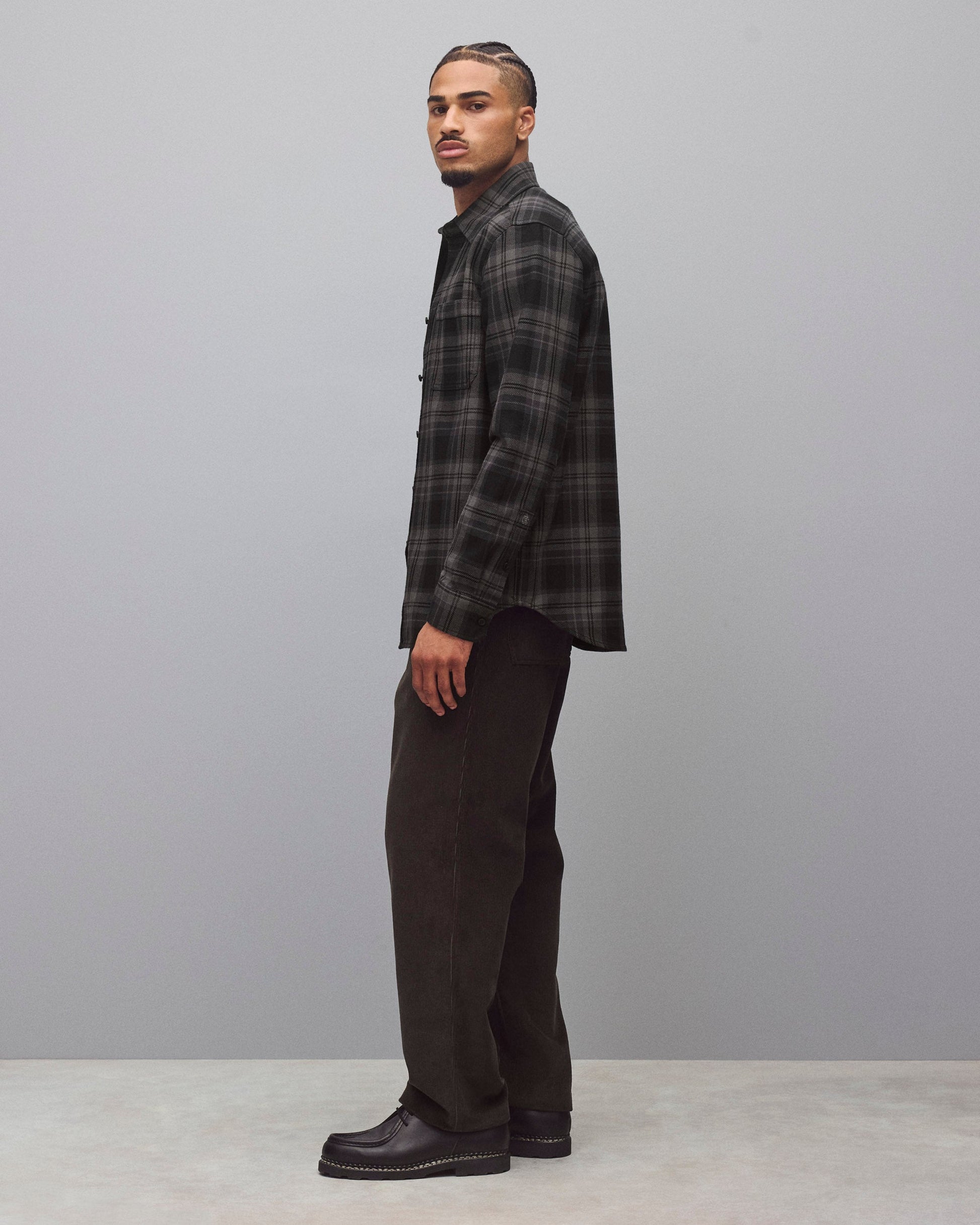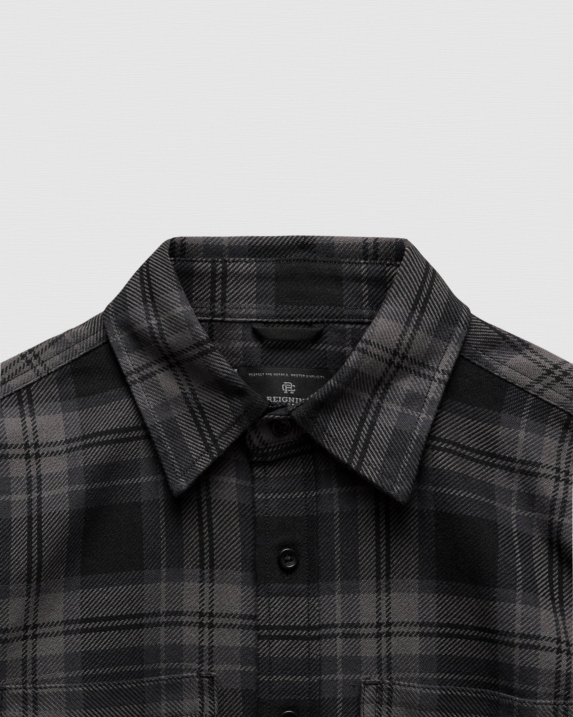 This plaid button-up shirt is crafted from a yarn-dyed cotton twill with structure and a soft finish. Designed in a boxy standard fit, with a pointed collar, chest pockets, corozo logo buttons, single button cuffs, and a scooped hem.