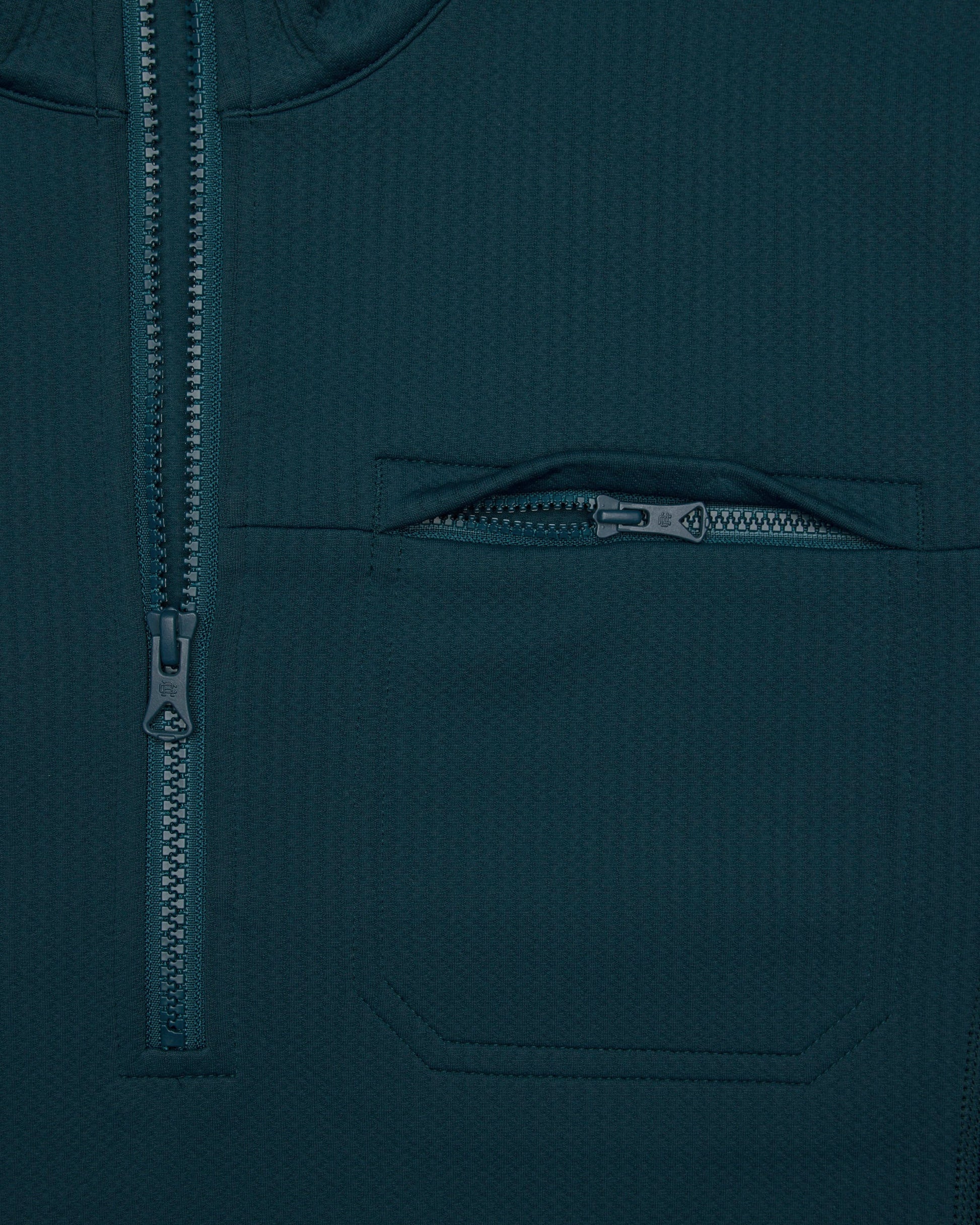 A dual-knit quarter zip engineered to provide efficient warmth in cooler conditions. This double knit stretch fabric features a textured face and smooth reverse, for exceptional next-to-skin comfort. Constructed in a trim athletic fit, with a mock neck collar, YKK Vislon zip closure, zip chest pocket, and self-fabric cuffs and hem.