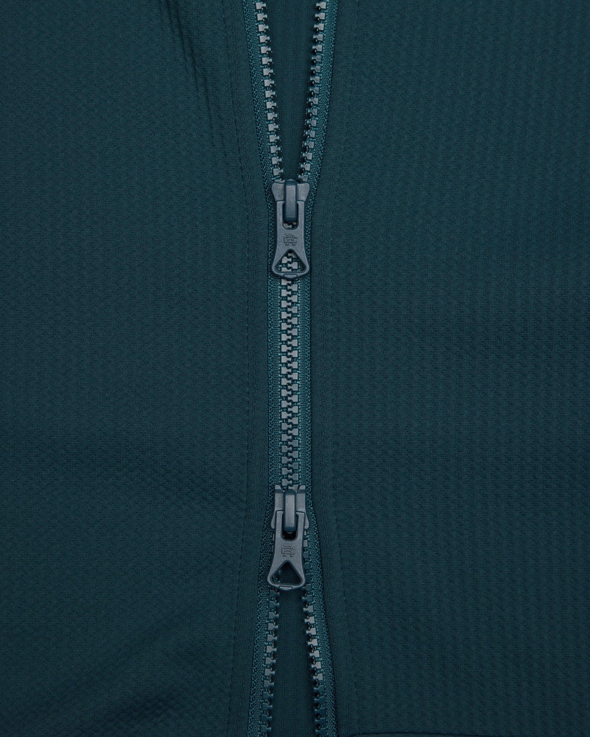 A dual-knit zip hoodie engineered to provide efficient warmth in cooler conditions. This double knit stretch fabric features a textured face and smooth reverse, for exceptional next-to-skin comfort. Constructed in a trim athletic fit, with a 2-layer hood, YKK Vislon two-way zip closure, front patch pockets, and self-fabric cuffs and hem.