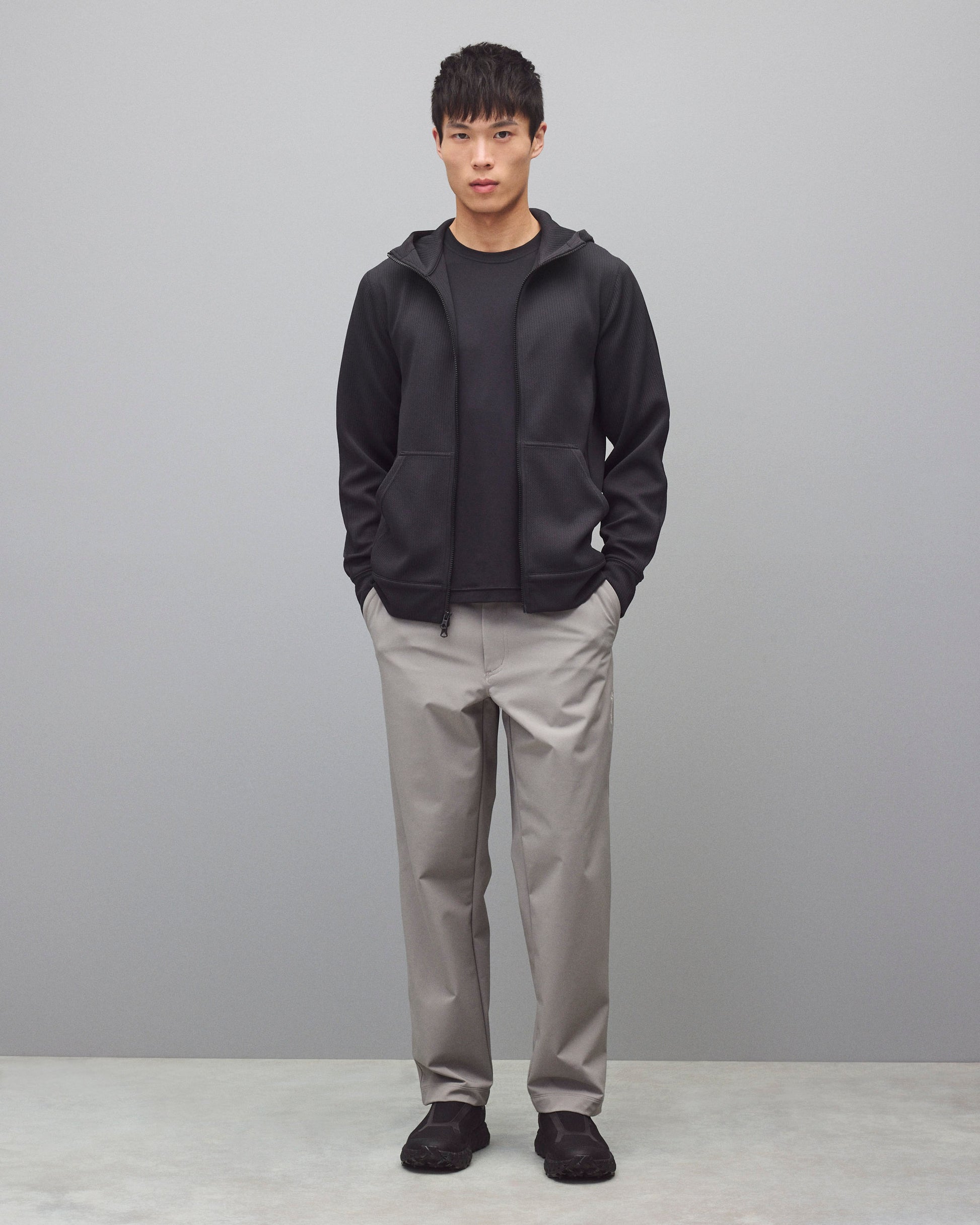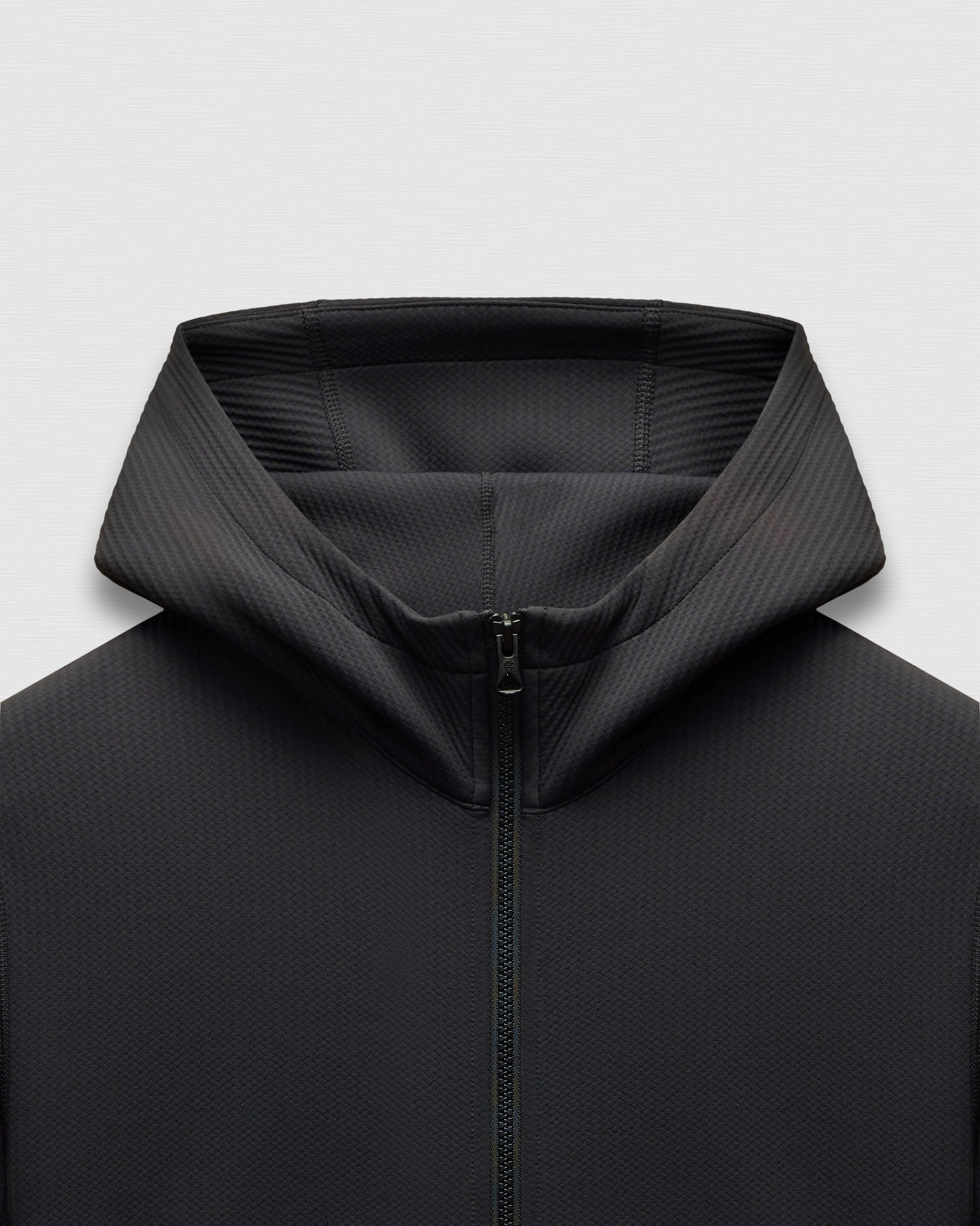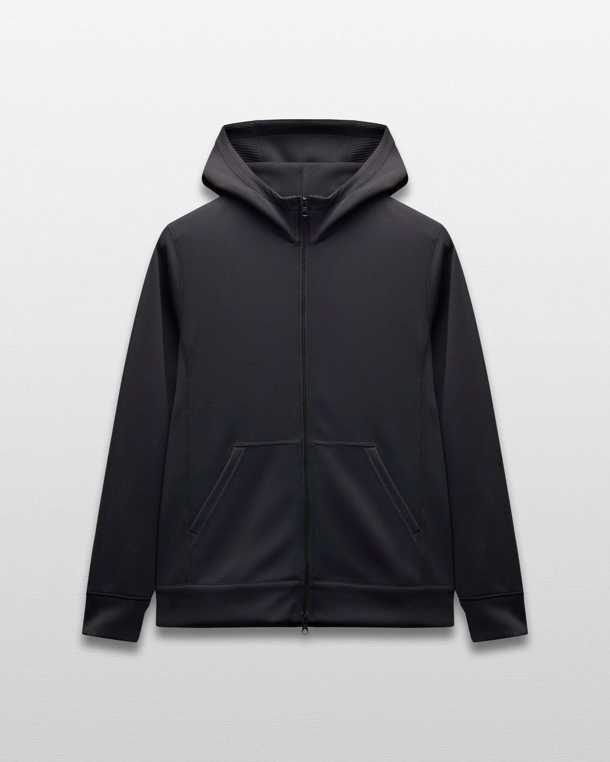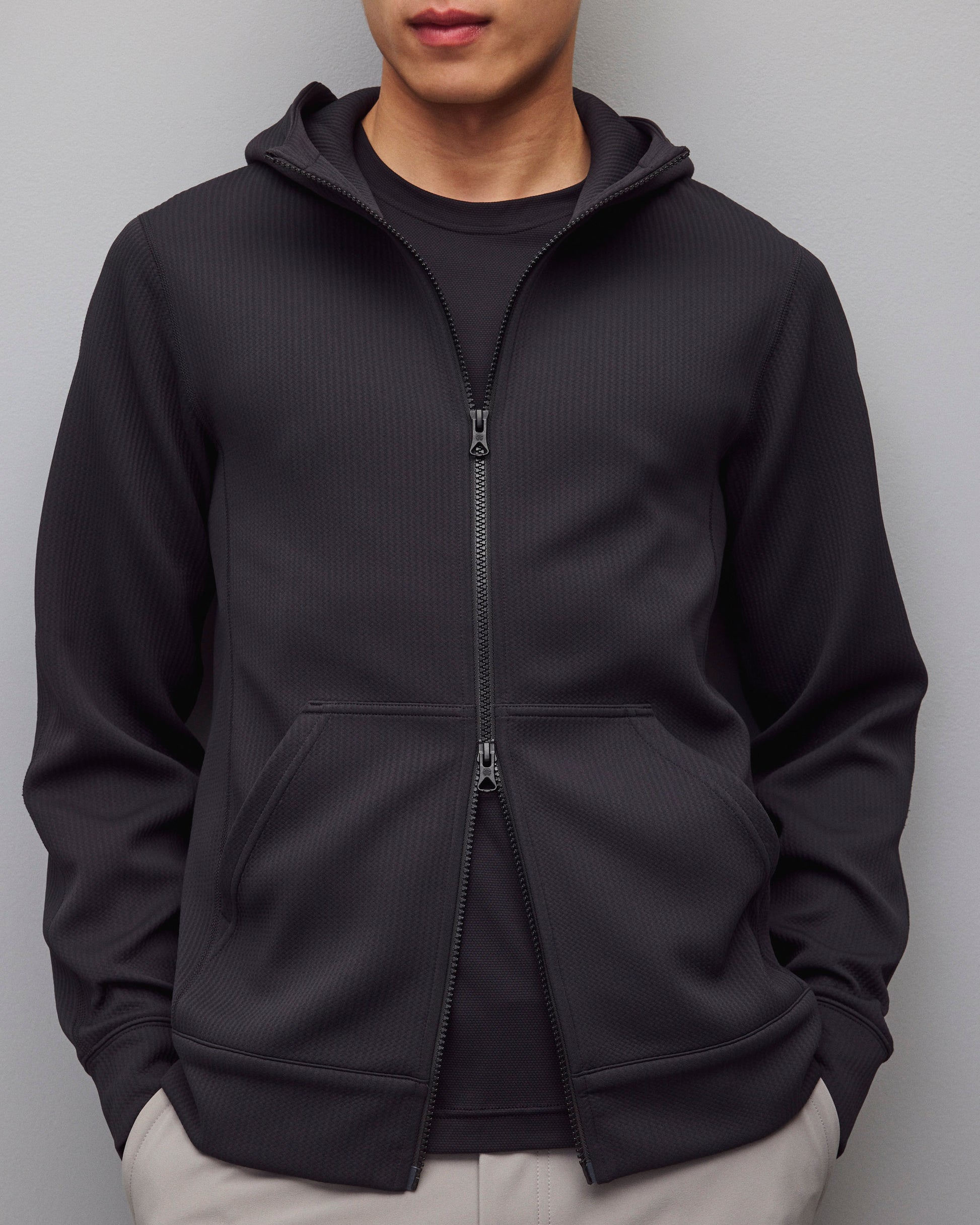 A dual-knit zip hoodie engineered to provide efficient warmth in cooler conditions. This double knit stretch fabric features a textured face and smooth reverse, for exceptional next-to-skin comfort. Constructed in a trim athletic fit, with a 2-layer hood, YKK Vislon two-way zip closure, front patch pockets, and self-fabric cuffs and hem.