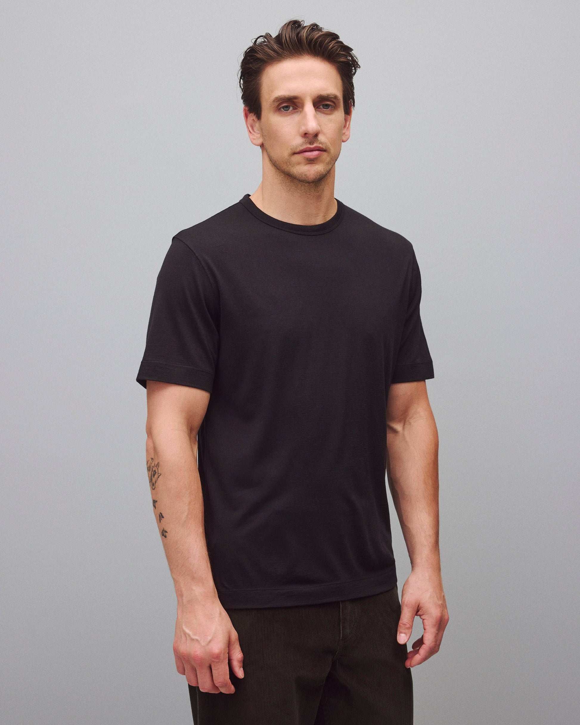This seasonal short sleeve is handcrafted from merino wool jersey, a lightweight knit that regulates body temperature and wicks moisture to keep you comfortable and dry. Designed in a standard athletic fit with a bound collar, set-in sleeves, and flatlock side seams.