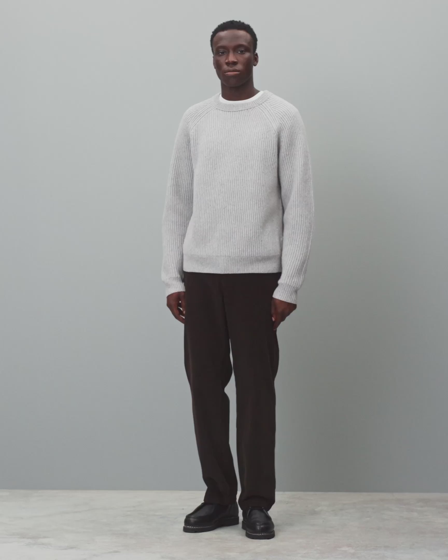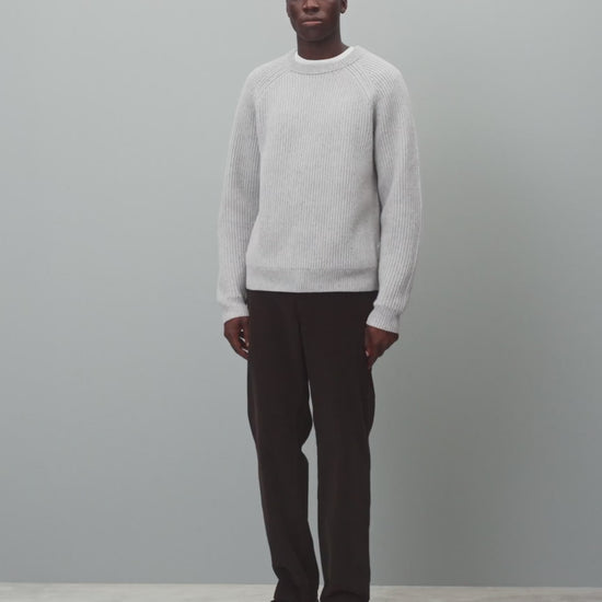 This knitted crewneck is crafted from nep merino wool, featuring small knots or clusters to impart distinctive character and feel. Constructed in a standard fit, with fully fashioned seams. Designed with a rib knit collar, raglan sleeves, side gussets, and rib knit cuffs and hem.