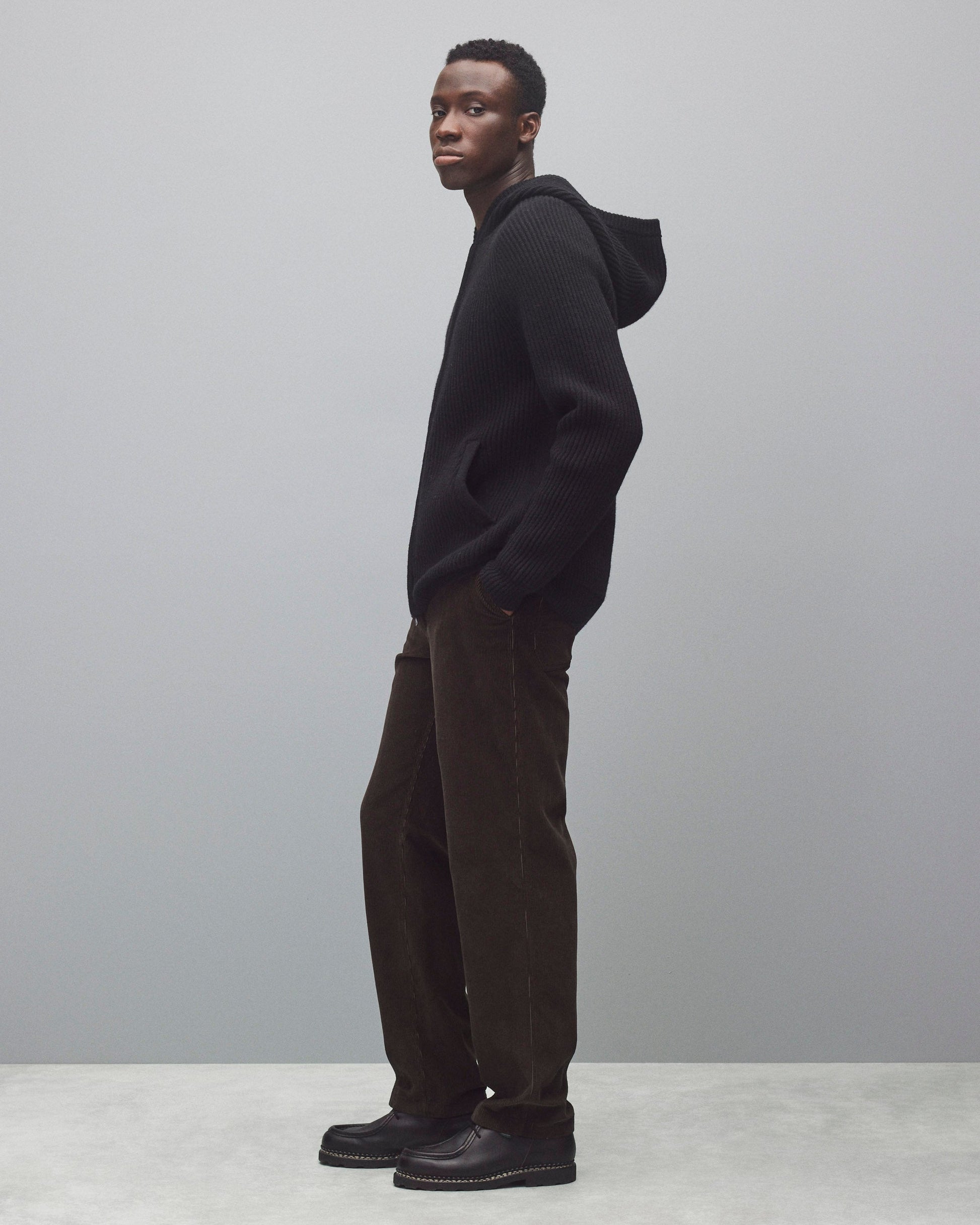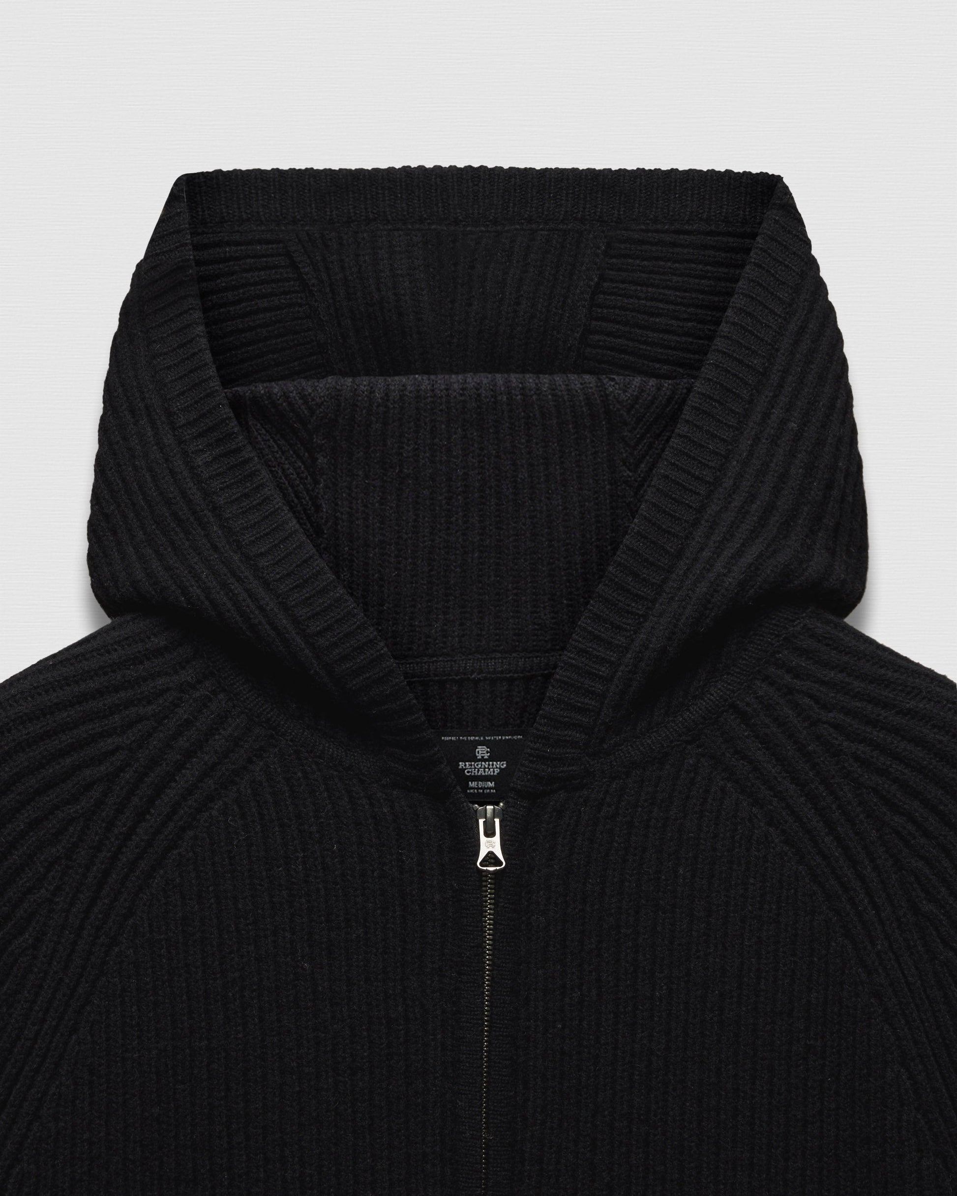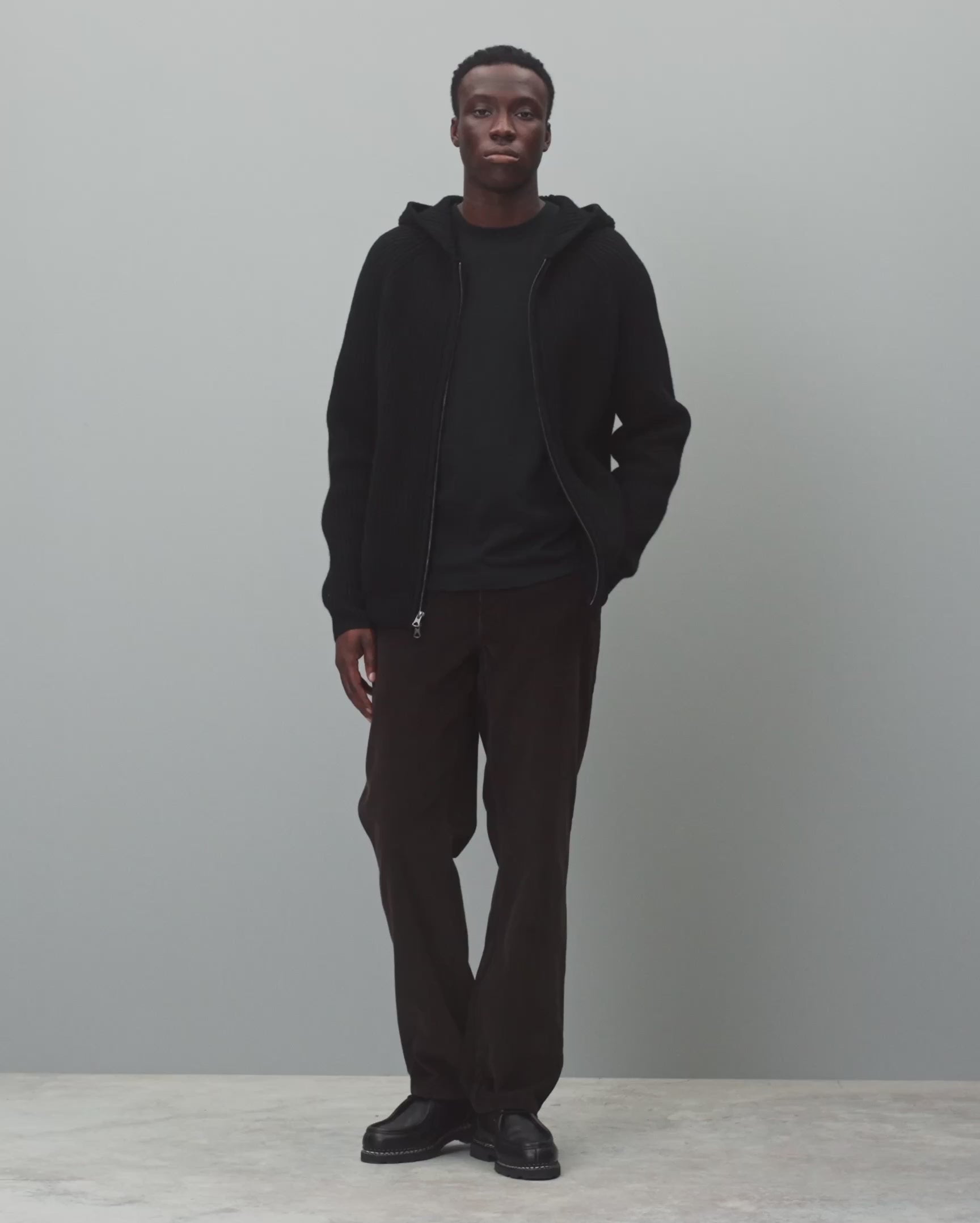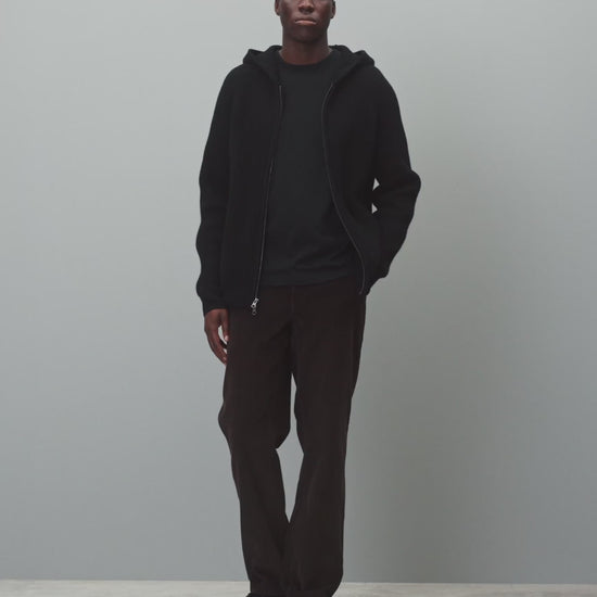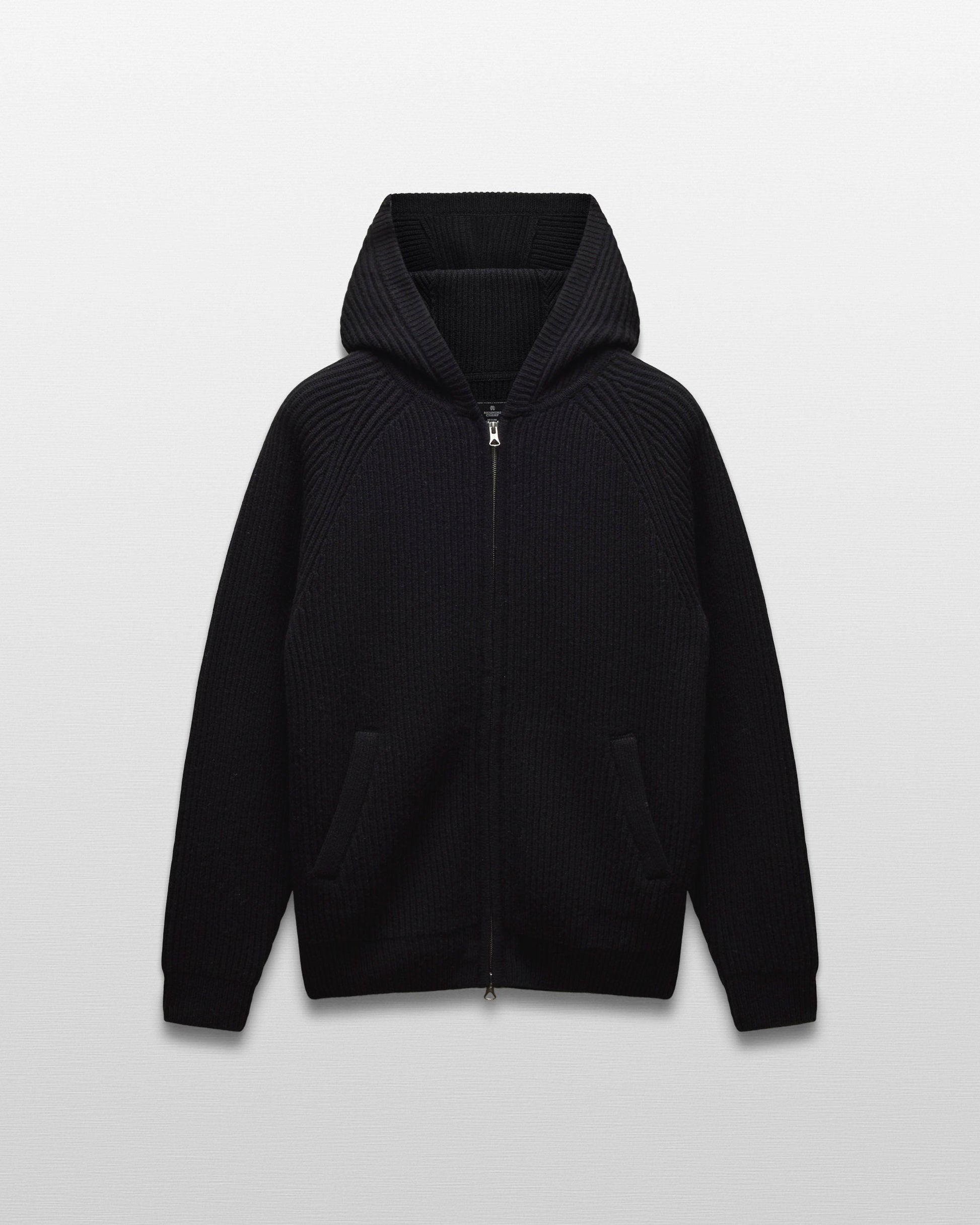 This knit hoodie is crafted from mid-gauge merino wool, prized for its natural softness, breathability, and temperature regulating properties. Designed in a standard fit with a YKK two-way metal zipper, raglan rib sleeves, besom pockets, and rib-knit cuffs and hem.