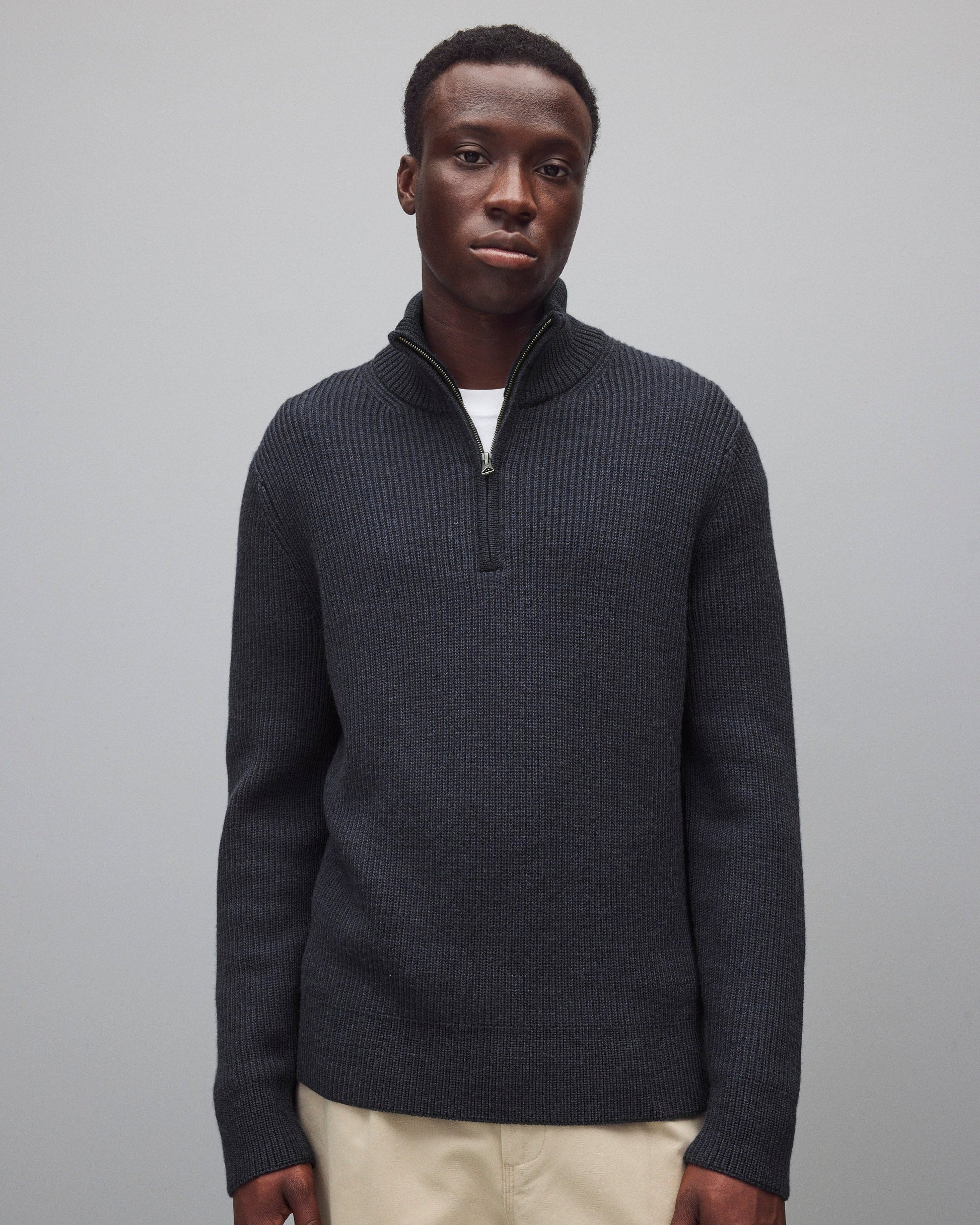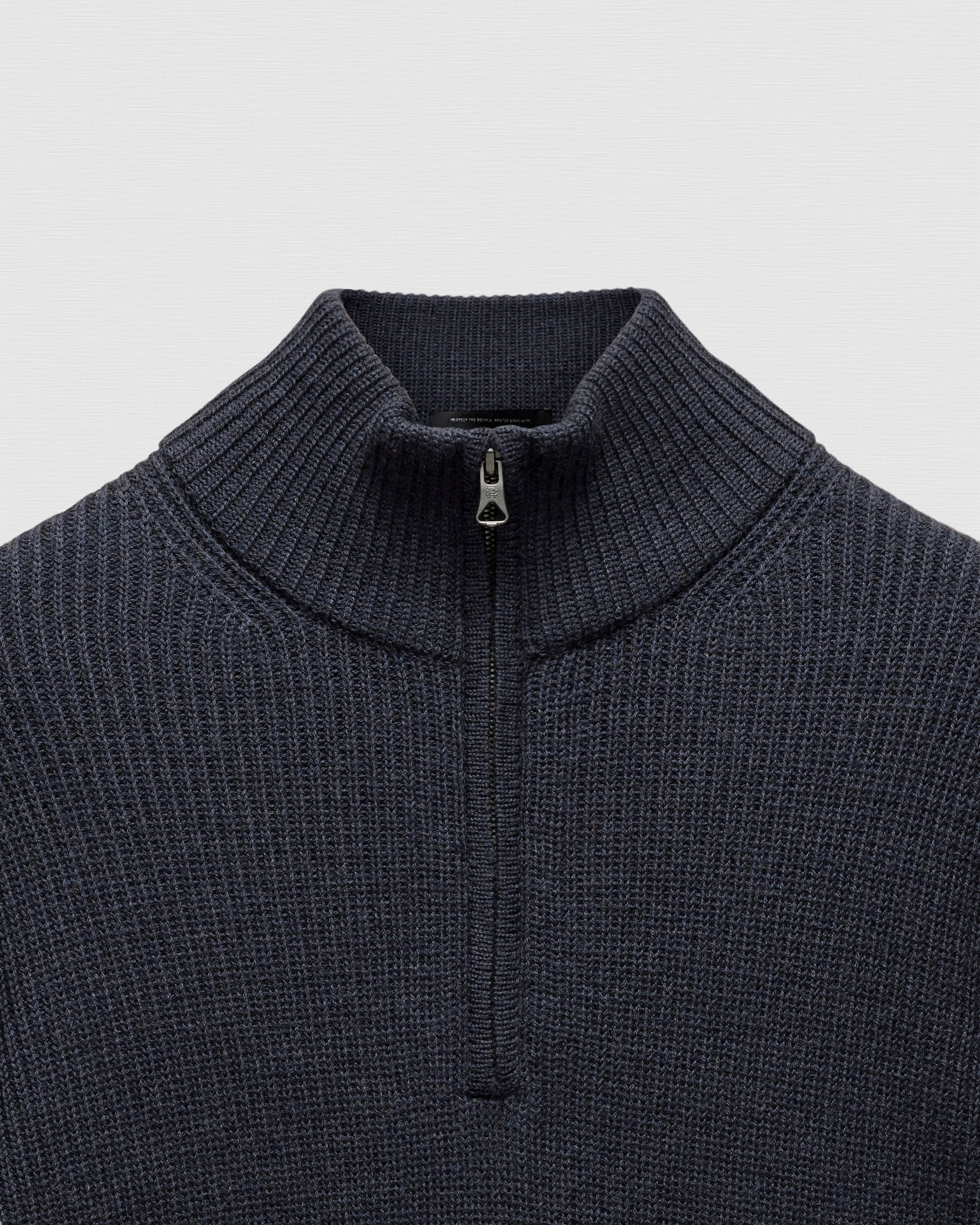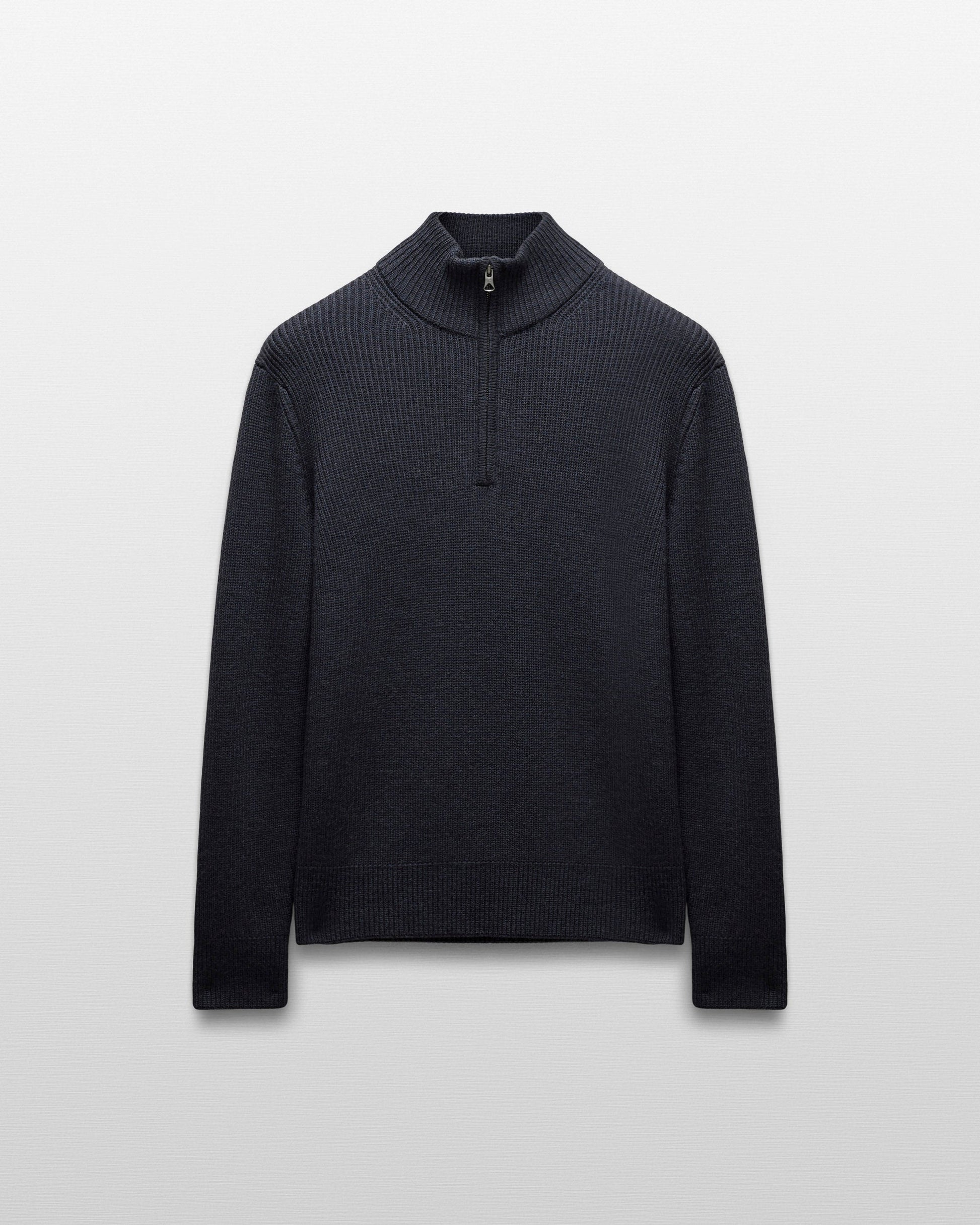 This mock neck quarter zip is crafted from extrafine Italian merino wool, prized for its natural softness, breathability, and temperature regulating properties. Featuring a standard fit, with fully fashioned seams. Designed with a convertible collar, a YKK metal zipper, and lycra-blended trim to enhance shape retention and durability.