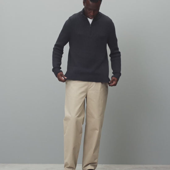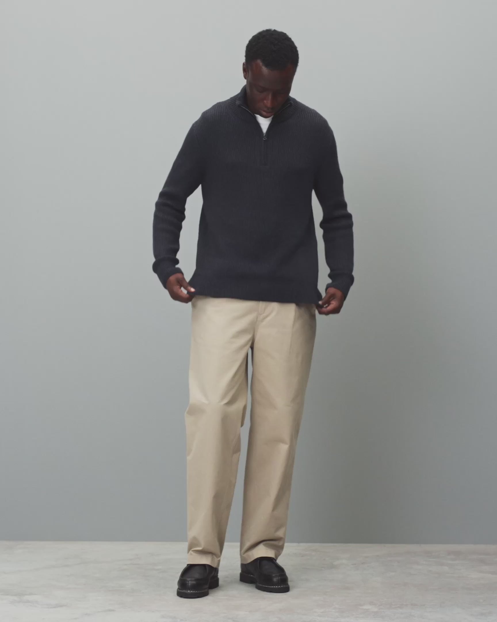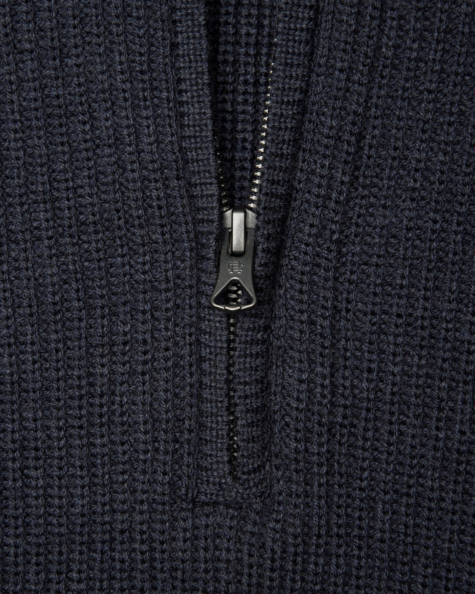 This mock neck quarter zip is crafted from extrafine Italian merino wool, prized for its natural softness, breathability, and temperature regulating properties. Featuring a standard fit, with fully fashioned seams. Designed with a convertible collar, a YKK metal zipper, and lycra-blended trim to enhance shape retention and durability.