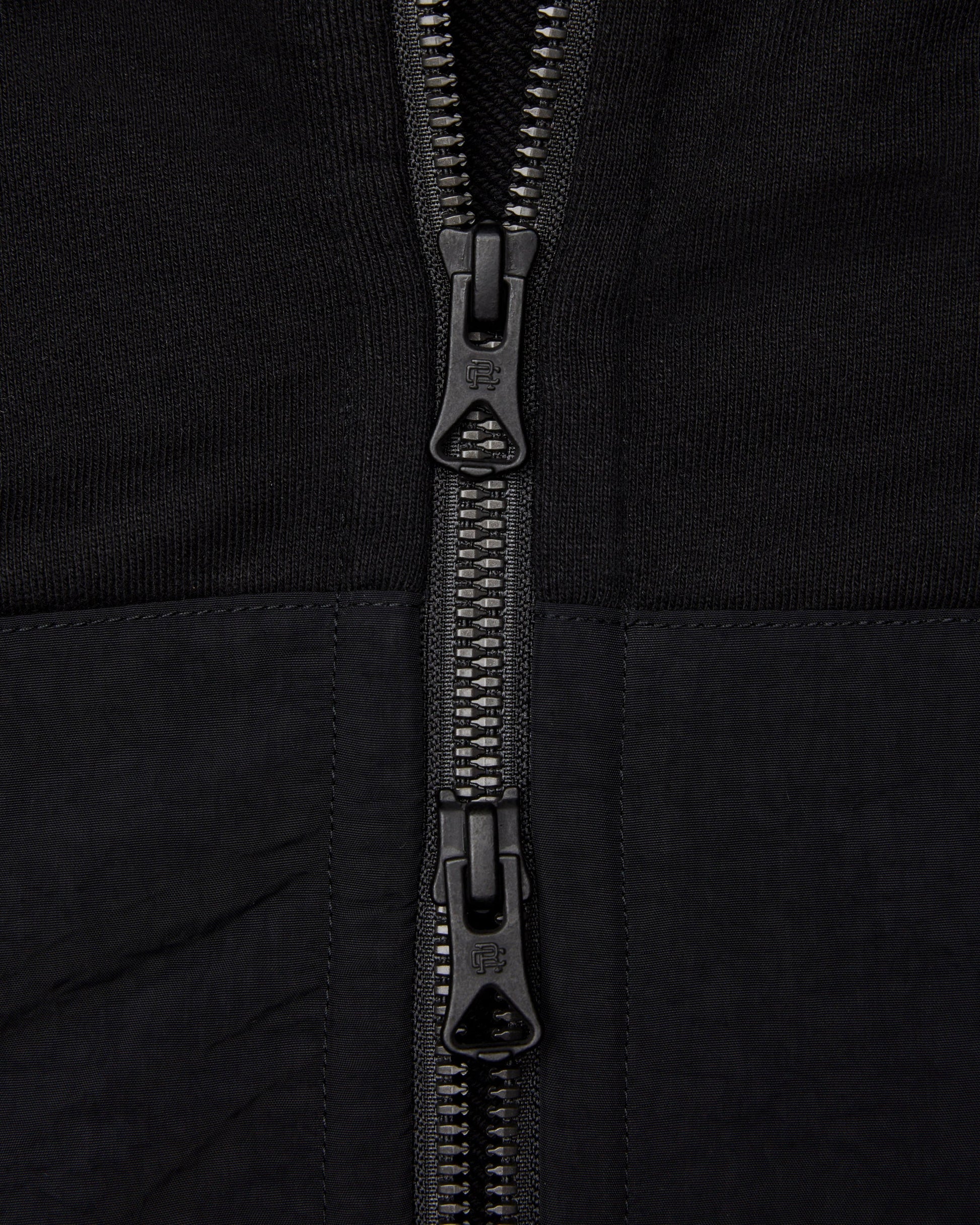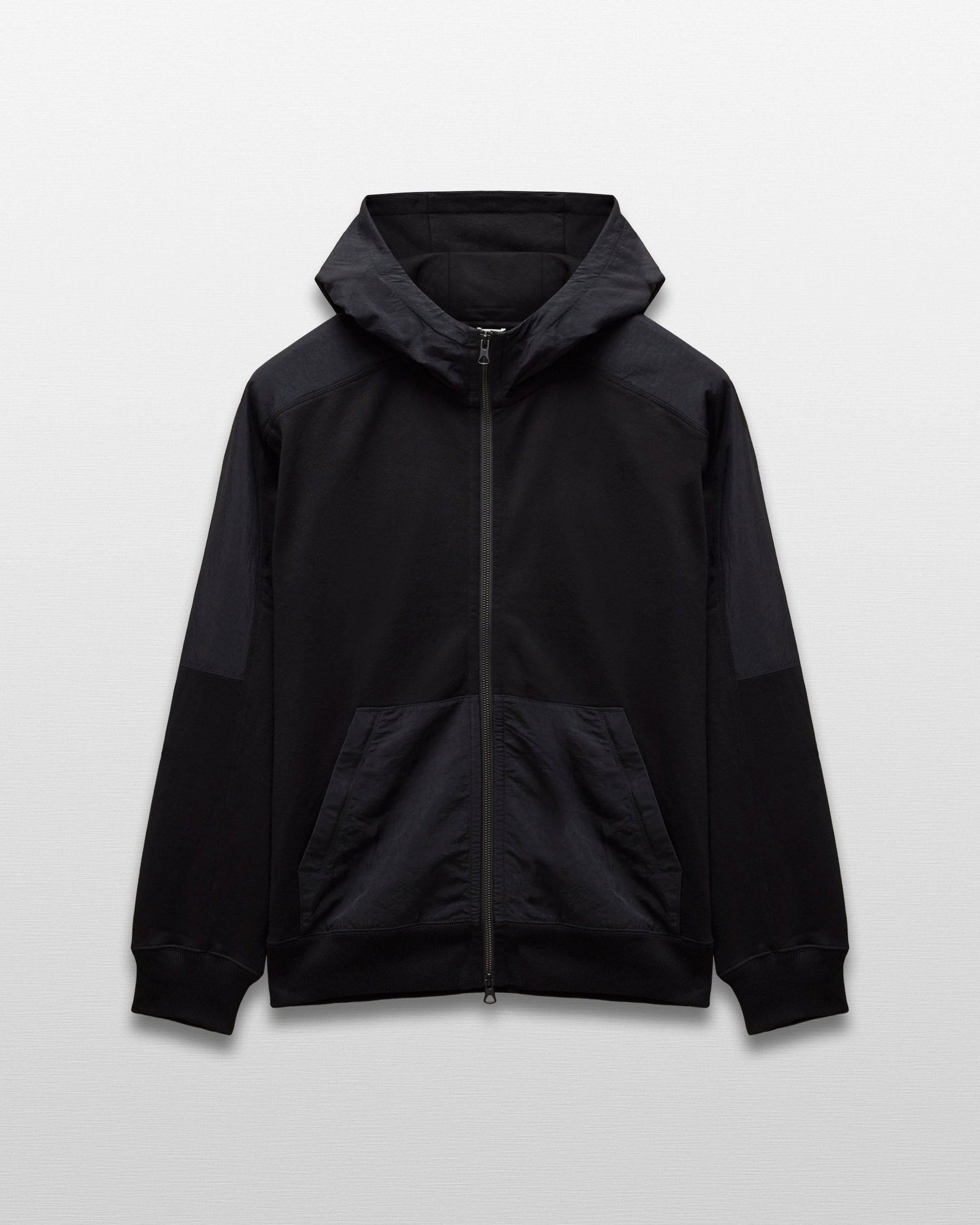 This hybrid hoodie combines our signature Midweight Terry with water-repellent nylon overlays for light protection. Designed with a standard athletic fit for a balanced silhouette. Featuring a scuba hood, YKK two-way metal zipper, shoulder yoke, secure zip pockets, and flatlock seams for lasting durability.