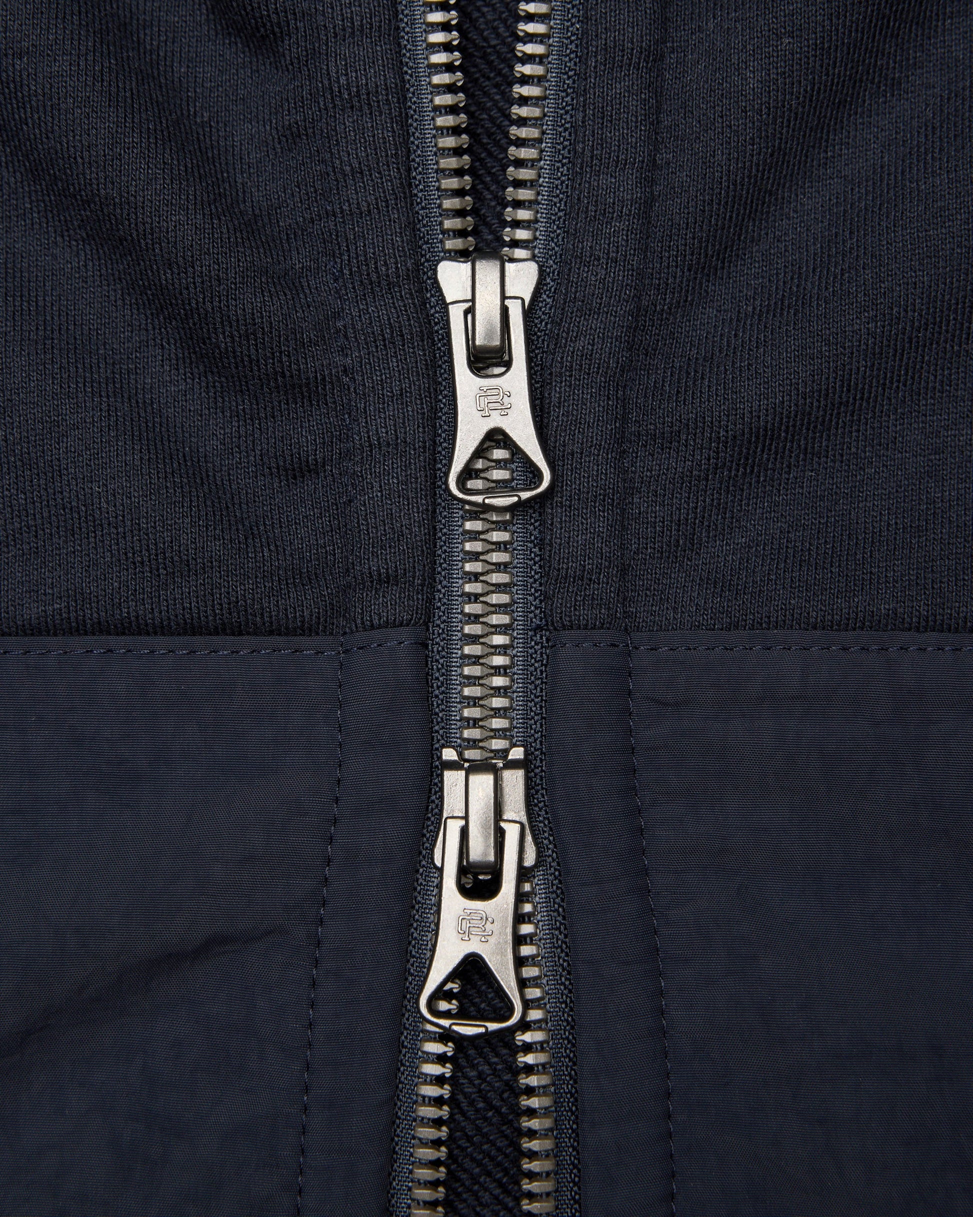 This hybrid hoodie combines our signature Midweight Terry with water-repellent nylon overlays for light protection. Designed with a standard athletic fit for a balanced silhouette. Featuring a scuba hood, YKK two-way metal zipper, shoulder yoke, secure zip pockets, and flatlock seams for lasting durability.