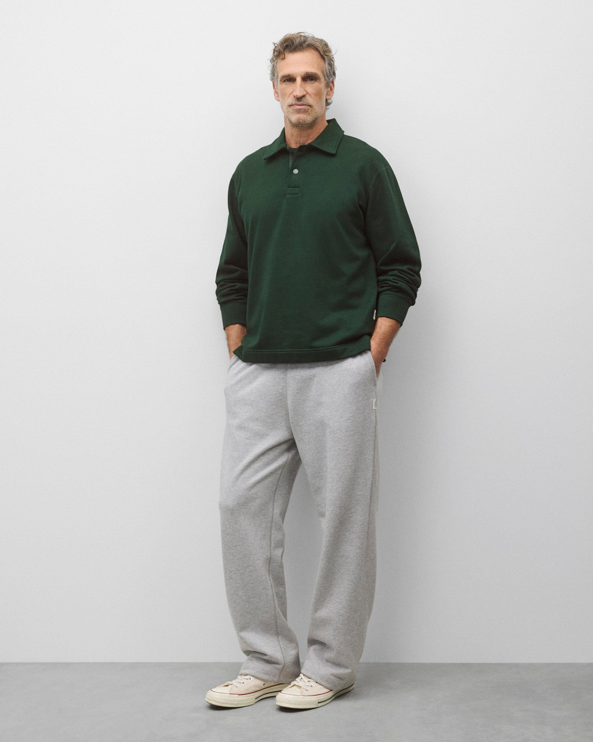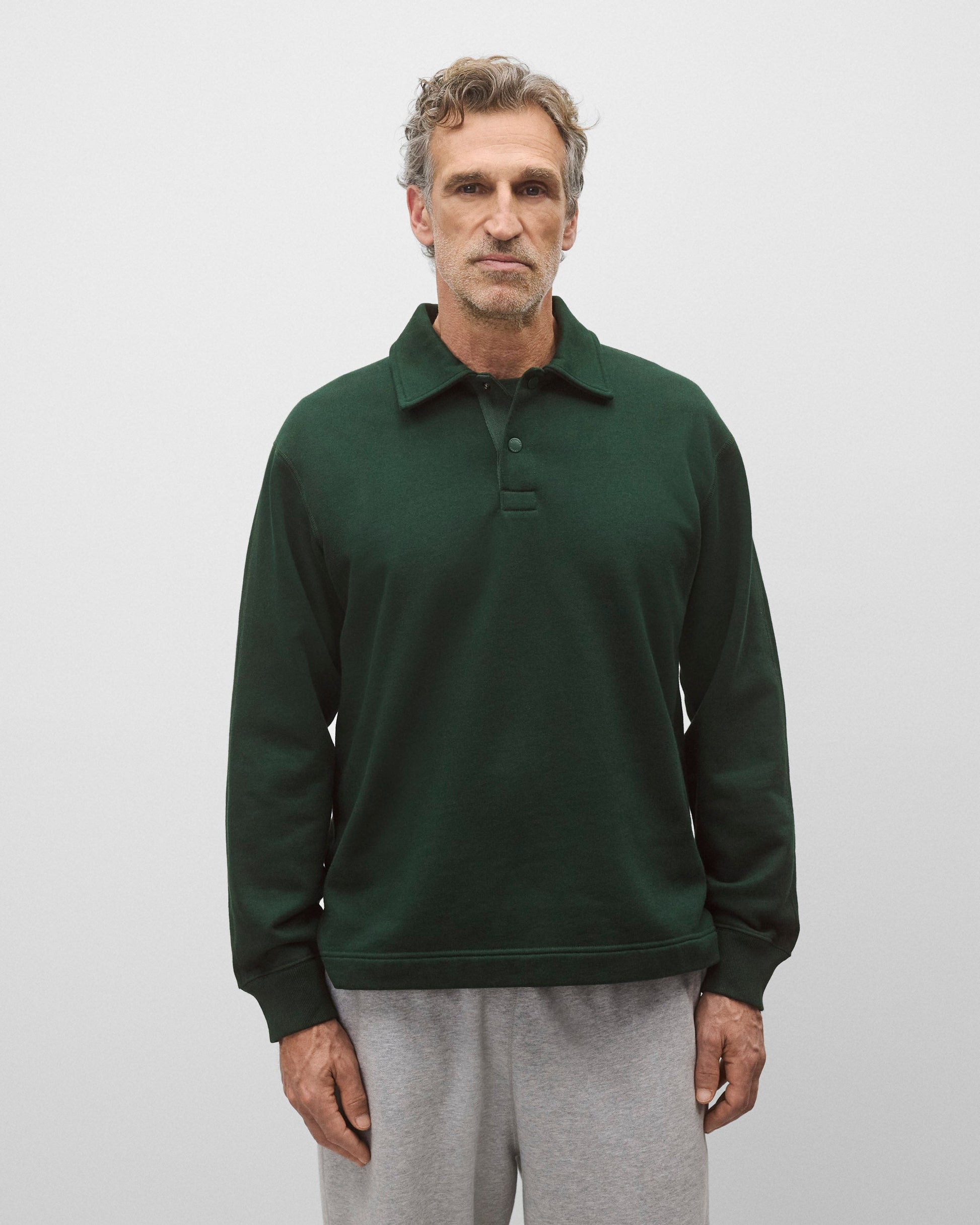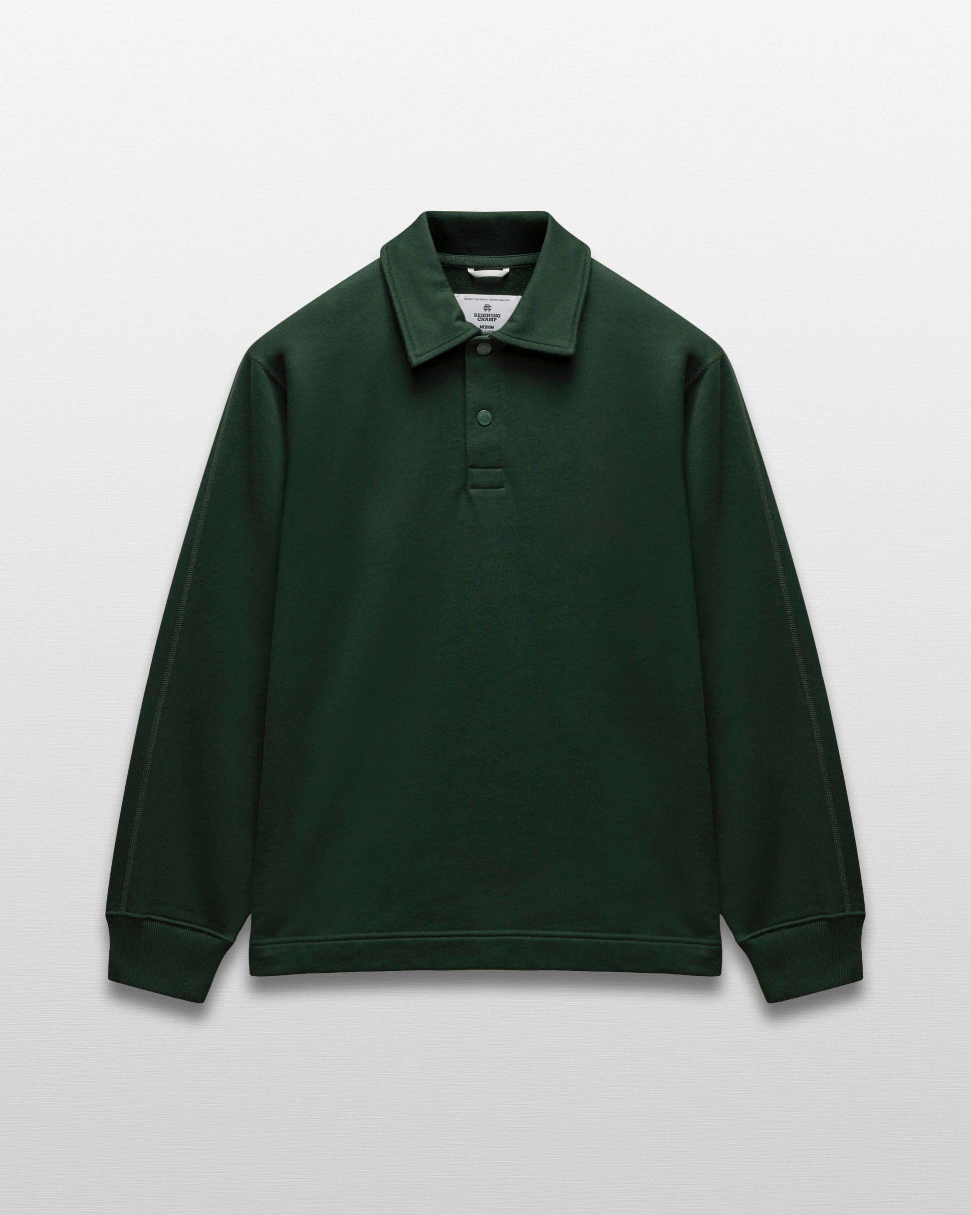 This collared rugby sweatshirt is made from premium Midweight Terry for an ideal balance of comfort and structure. Designed with metal logo snaps, a herringbone tape placket, semi-raglan sleeves, a side slit hem, and premium rib.
