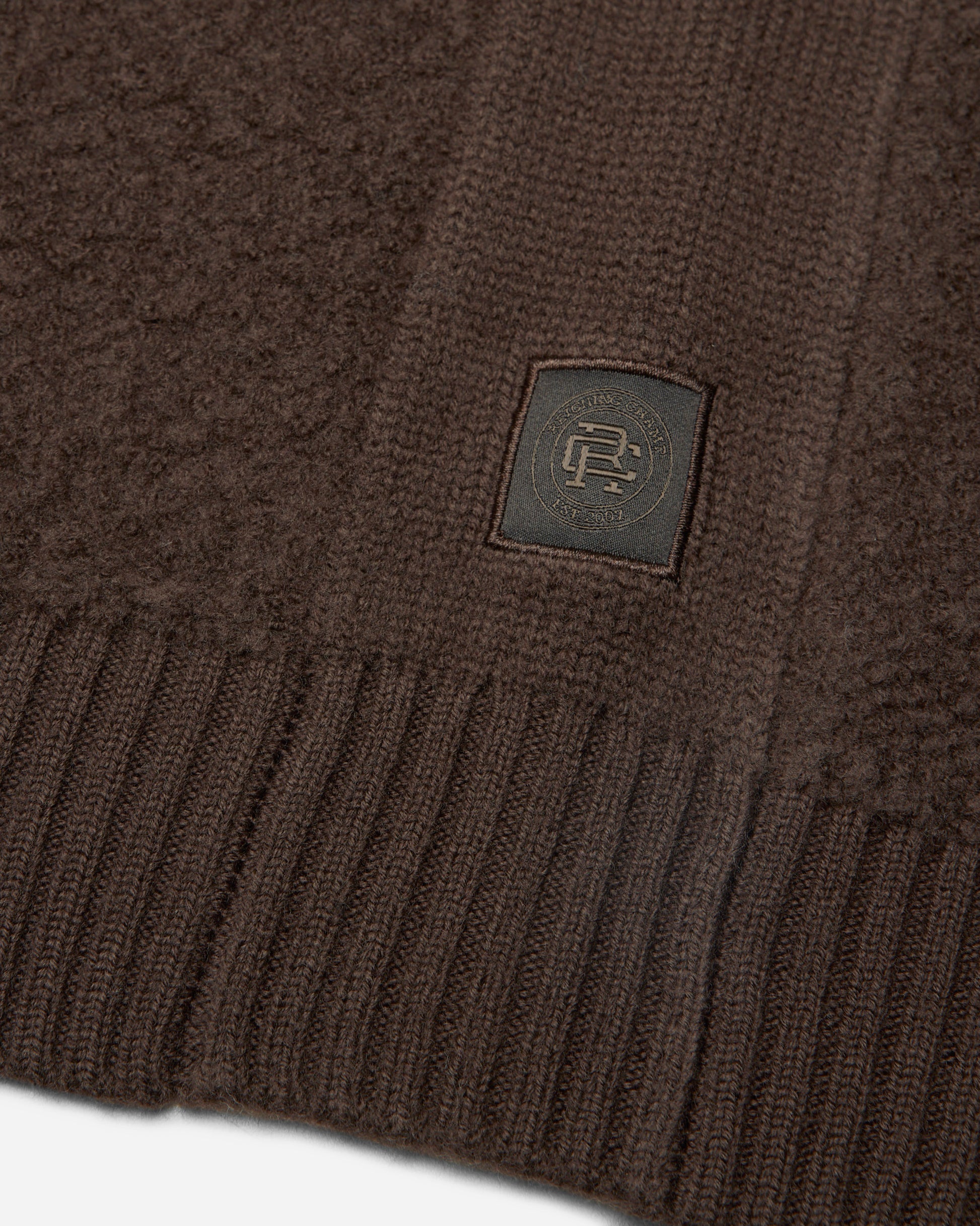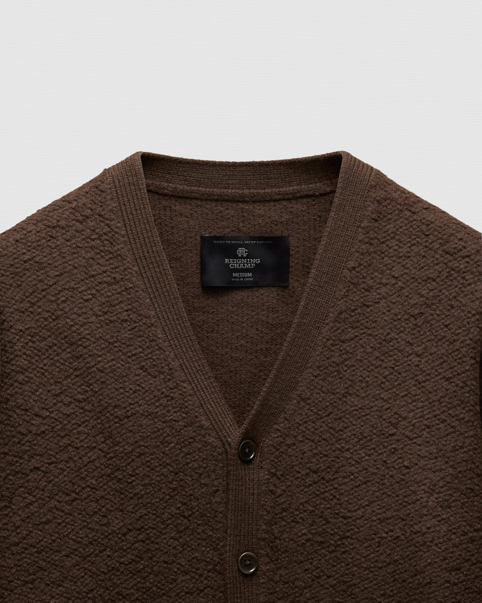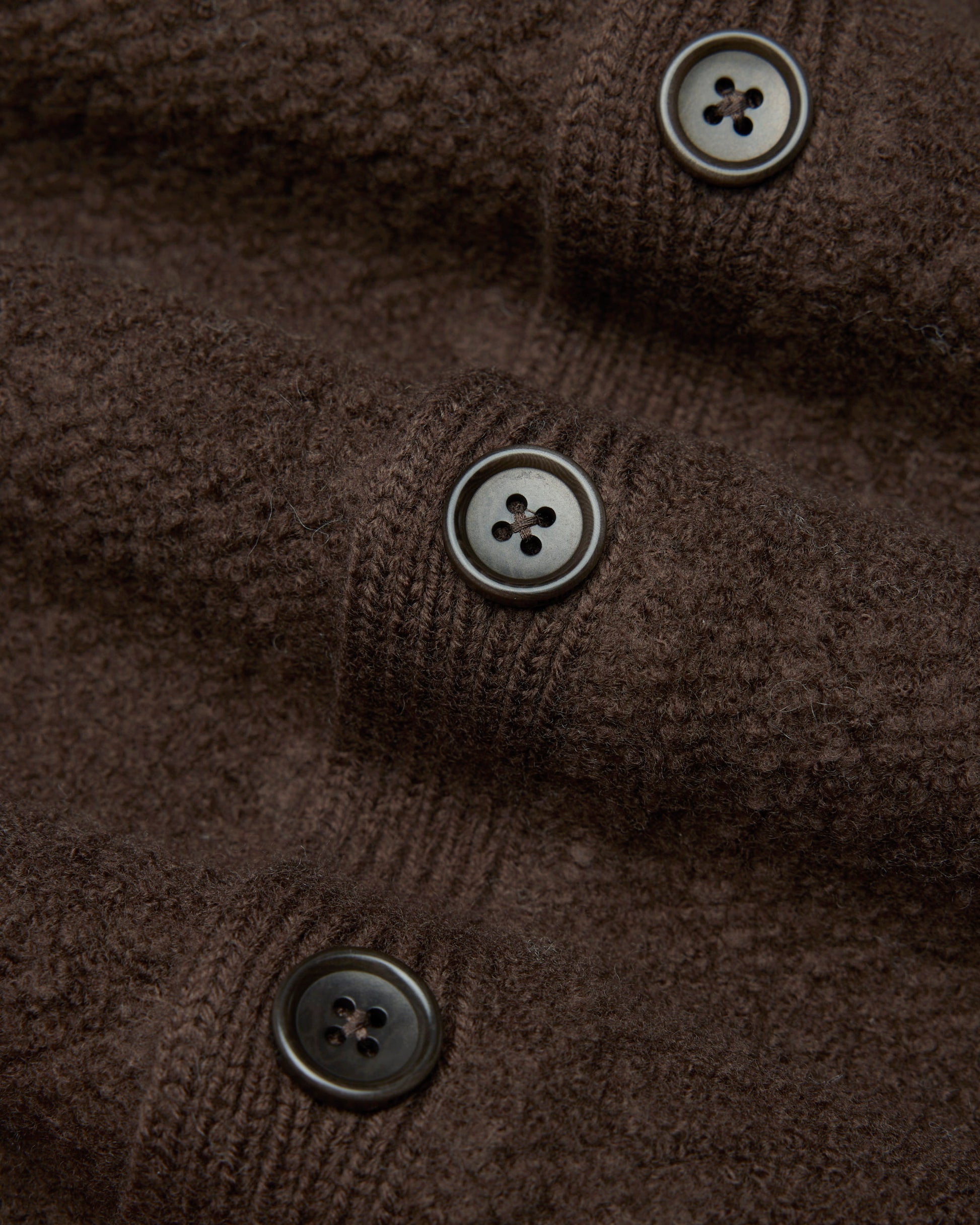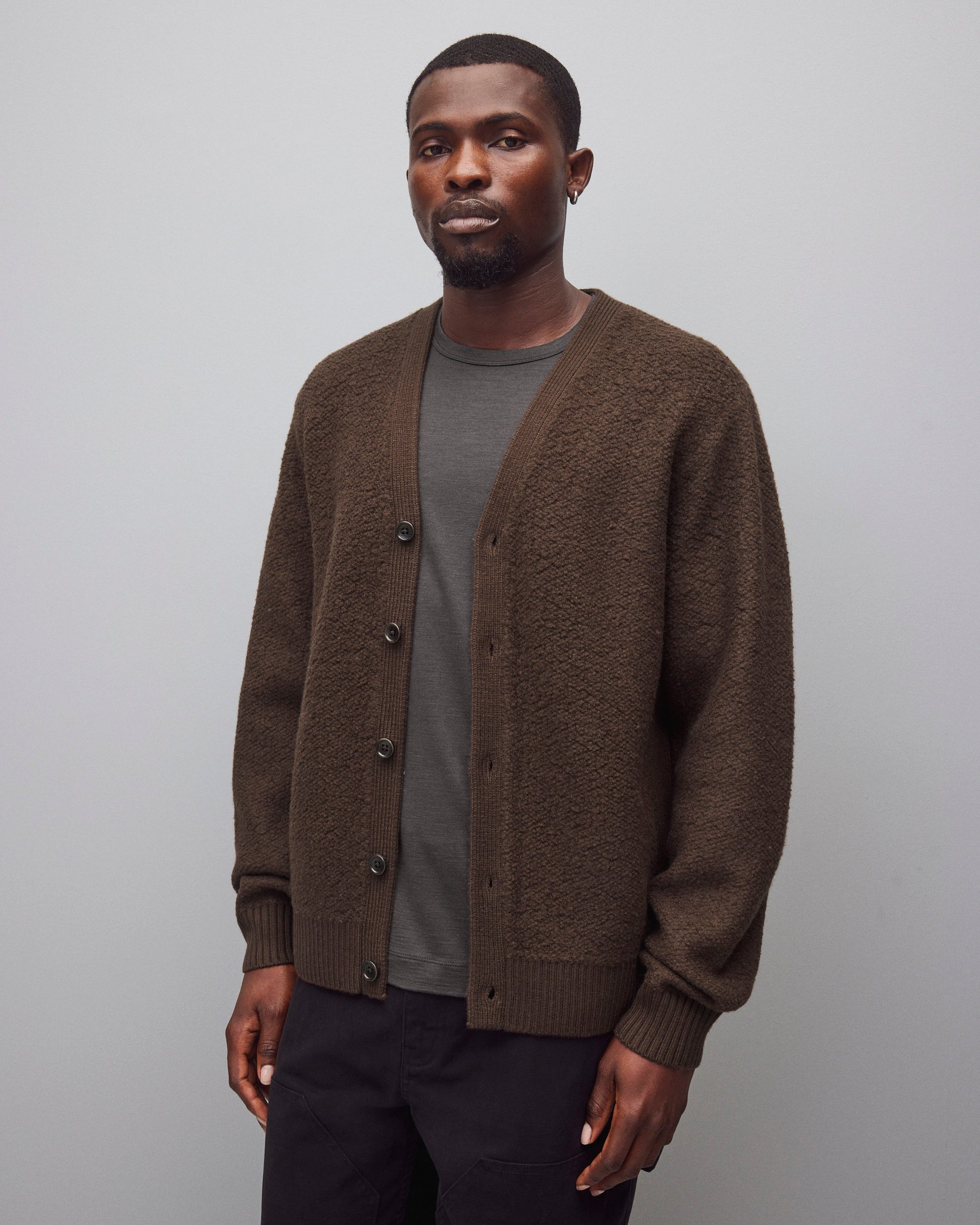 This winter-weight cardigan is knit from a merino-cotton blend with a curly, boucle-textured feel. Featuring a standard fit, with full-cut sleeves and torso to provide versatility for layering. Designed with a tonal corozo button placket, side gussets, and rib knit cuffs and hem. Finished with a raised needle punch logo at side hem.