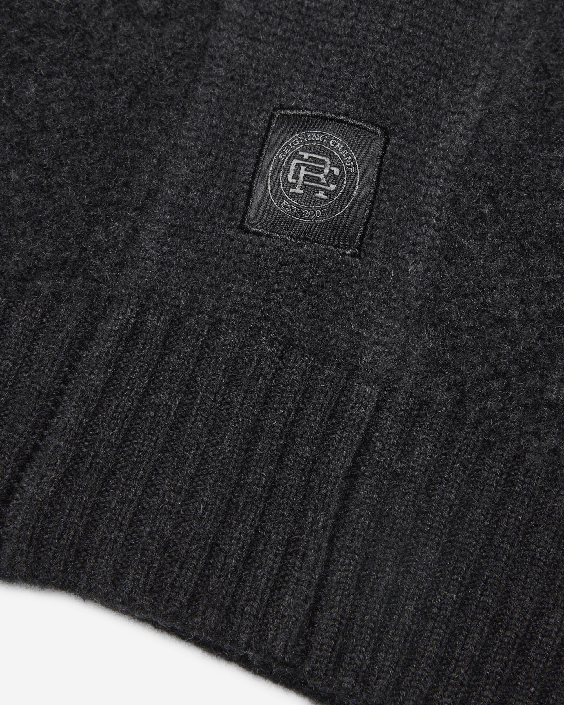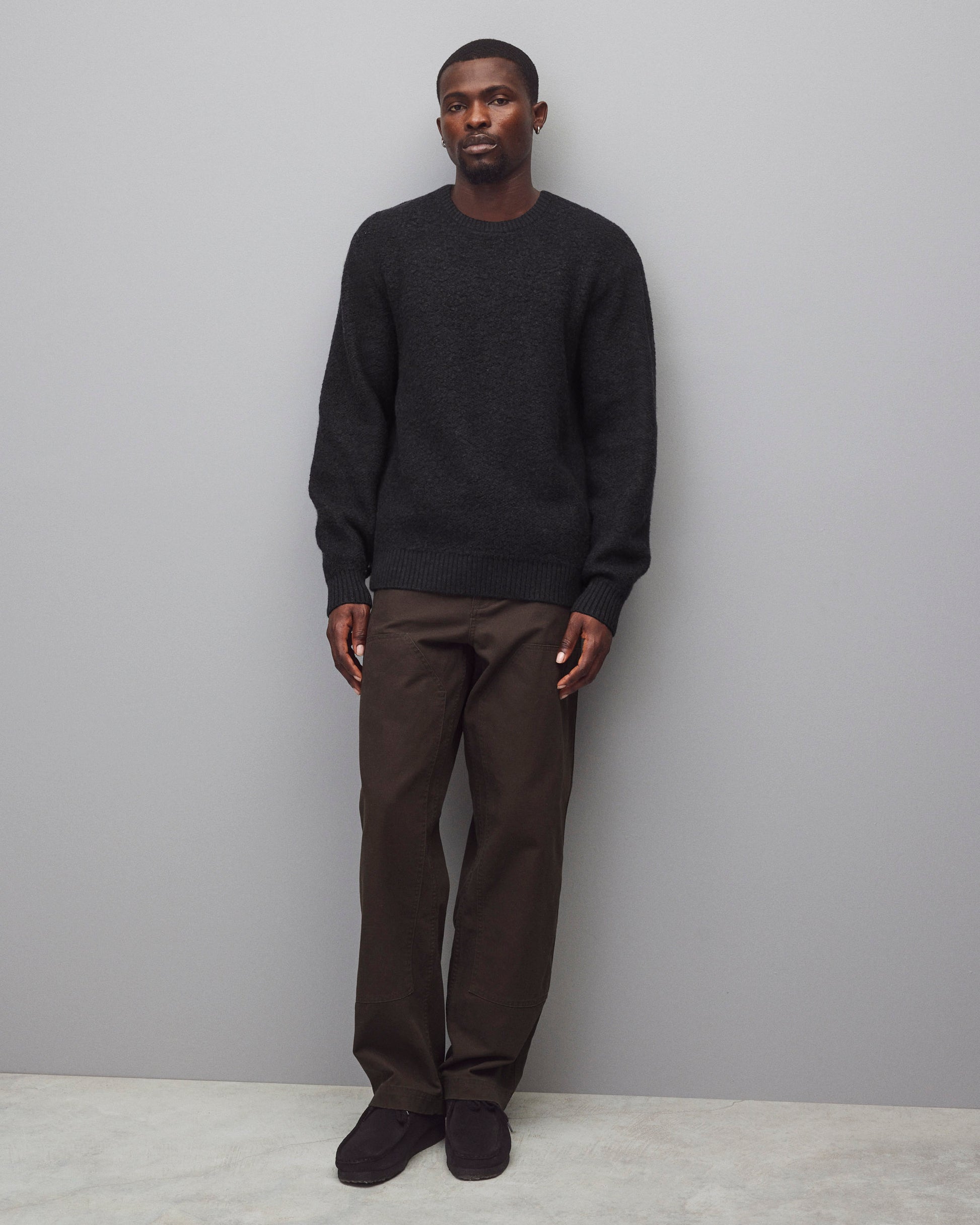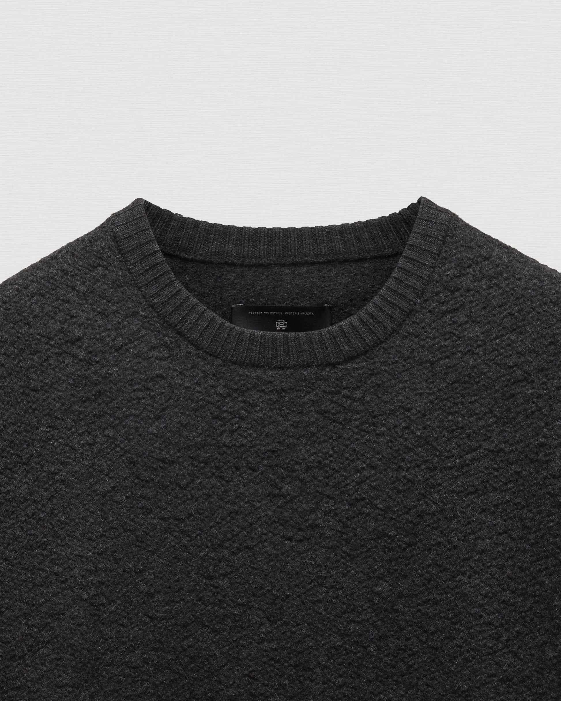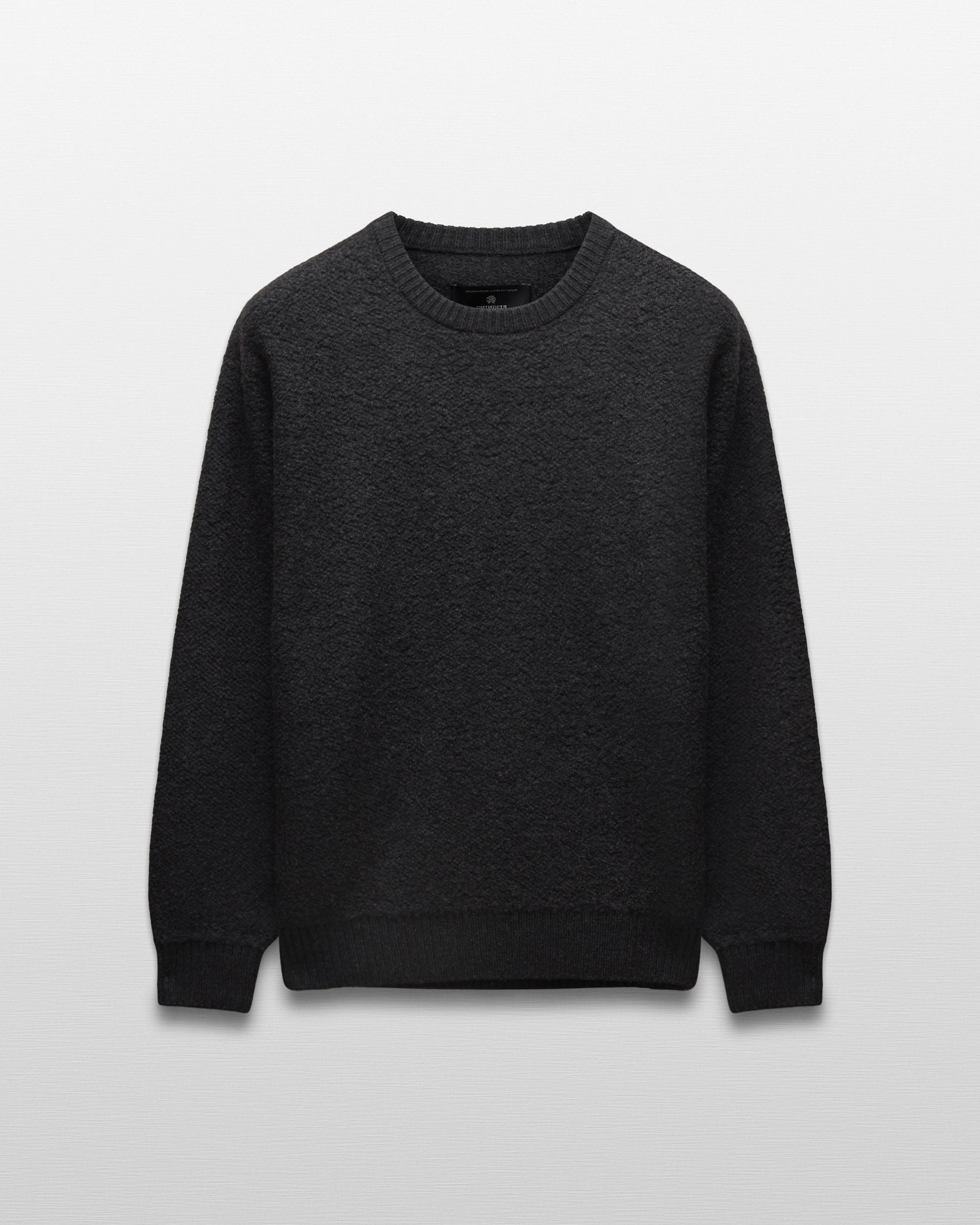 This winter-weight crewneck sweater is knit from a merino-cotton blend with a curly, boucle-textured feel. Featuring a standard fit, with full-cut sleeves and torso to provide versatility for layering. Designed with a double rib collar, side gussets, and rib knit cuffs and hem. Finished with a raised needle punch logo at side hem.