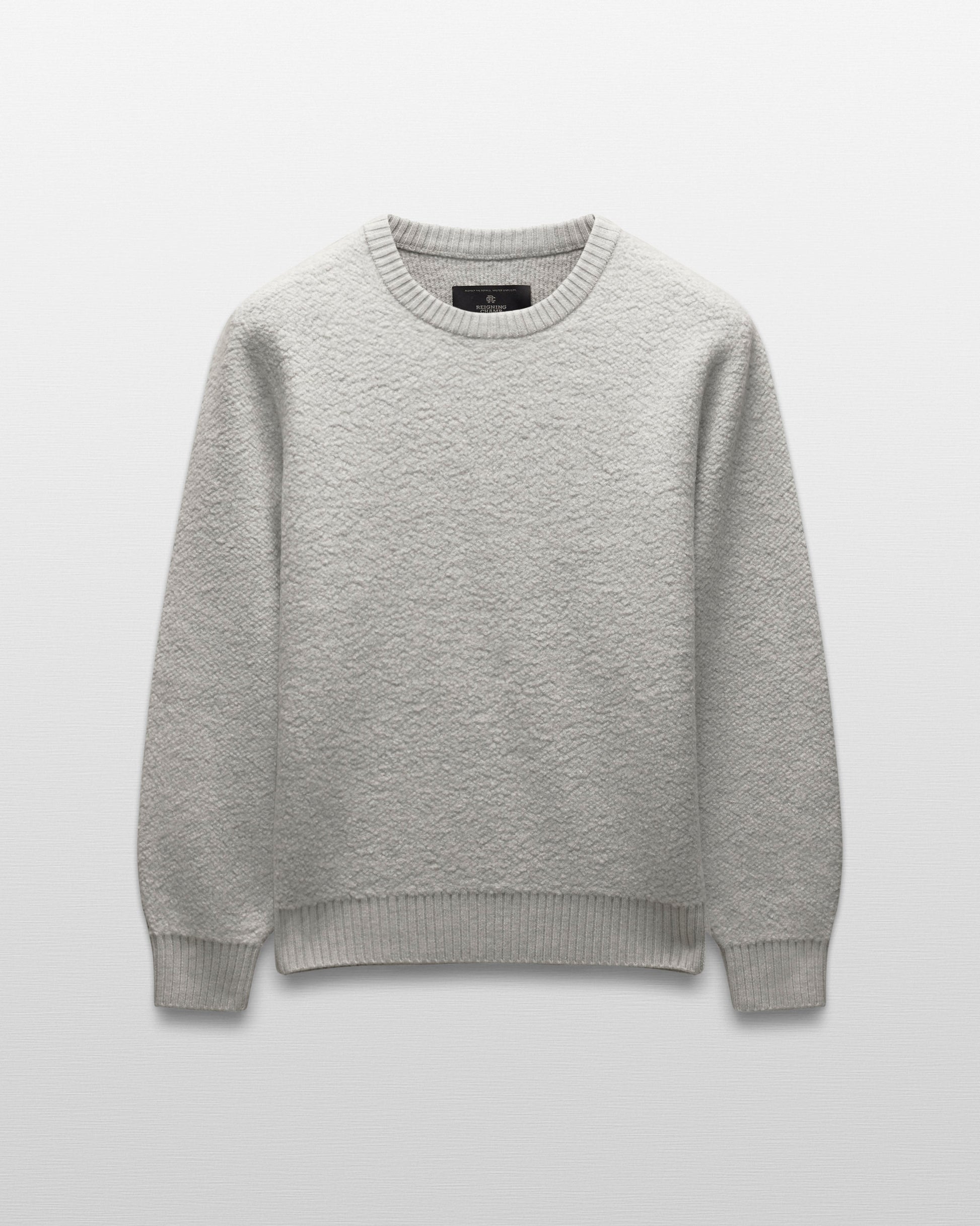 This winter-weight crewneck sweater is knit from a merino-cotton blend with a curly, boucle-textured feel. Featuring a standard fit, with full-cut sleeves and torso to provide versatility for layering. Designed with a double rib collar, side gussets, and rib knit cuffs and hem. Finished with a raised needle punch logo at side hem.