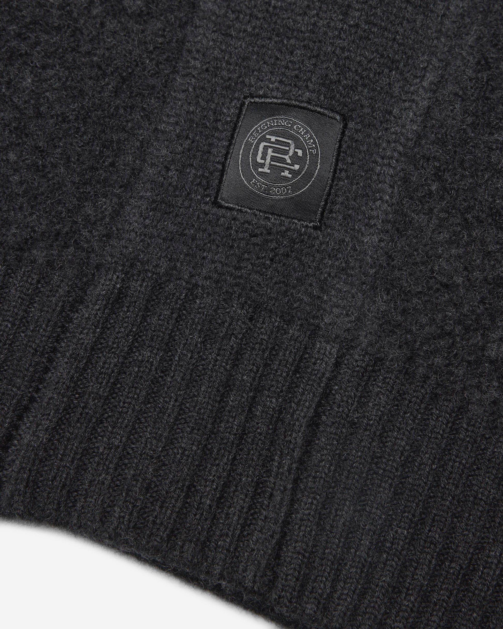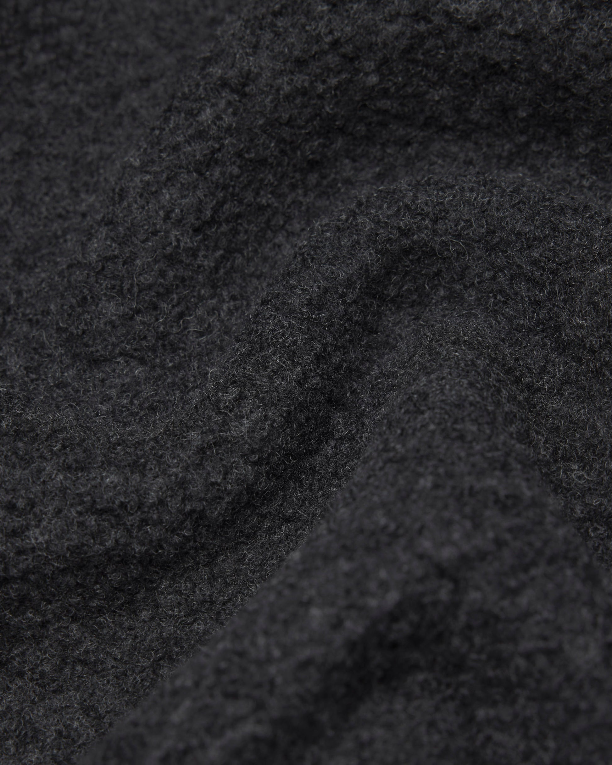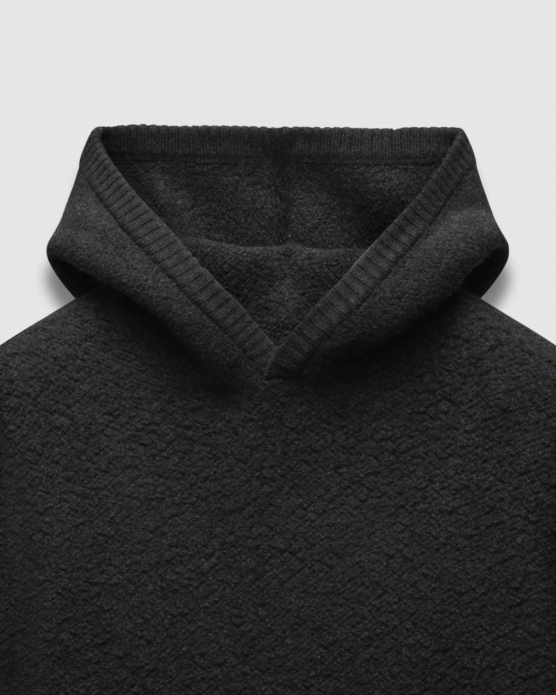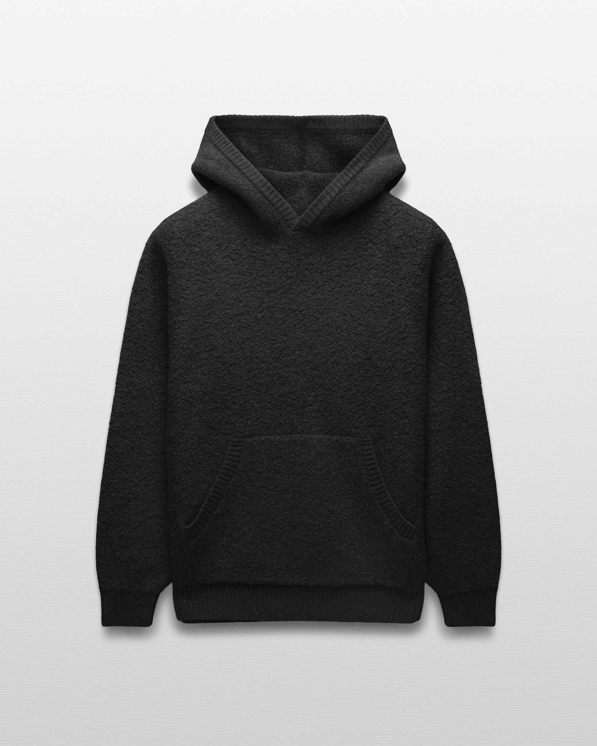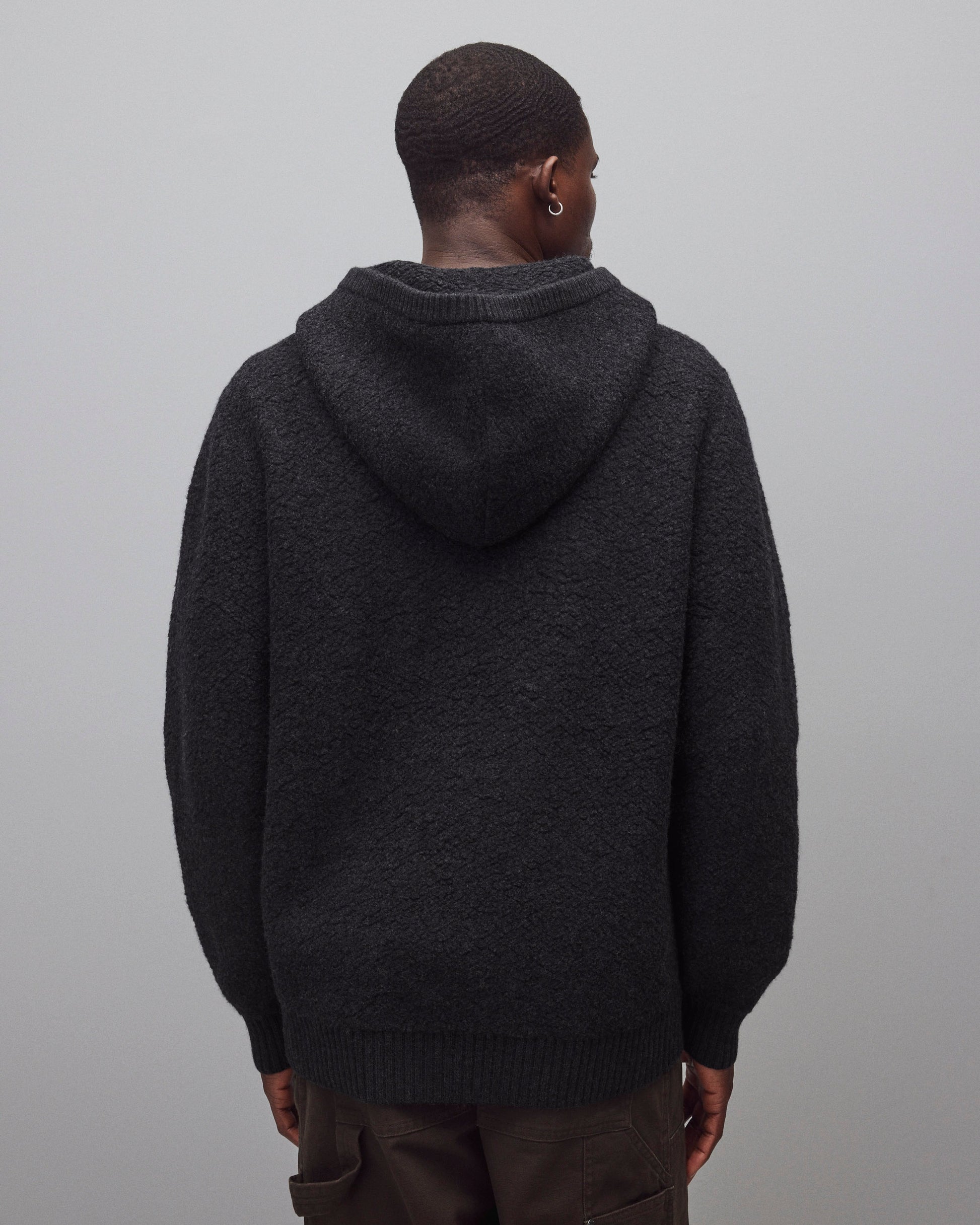This winter-weight hoodie is knit from a merino-cotton blend with a curly, boucle-textured feel. Featuring a standard fit, with full-cut sleeves and torso to provide versatility for layering. Designed with a dual-layer crossover hood, ribbed front pocket, side gussets, and rib knit cuffs and hem. Finished with a raised needle punch logo at side hem.