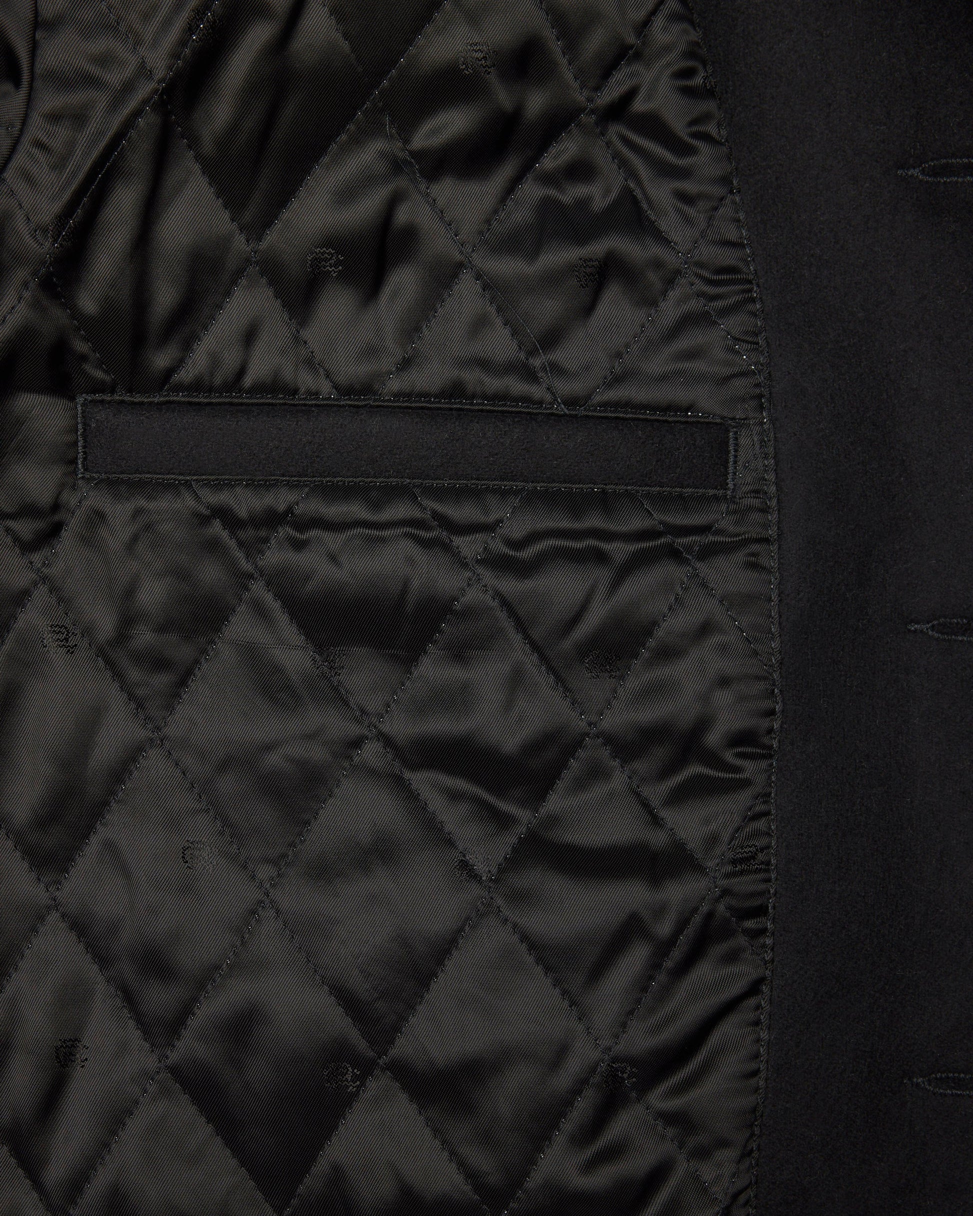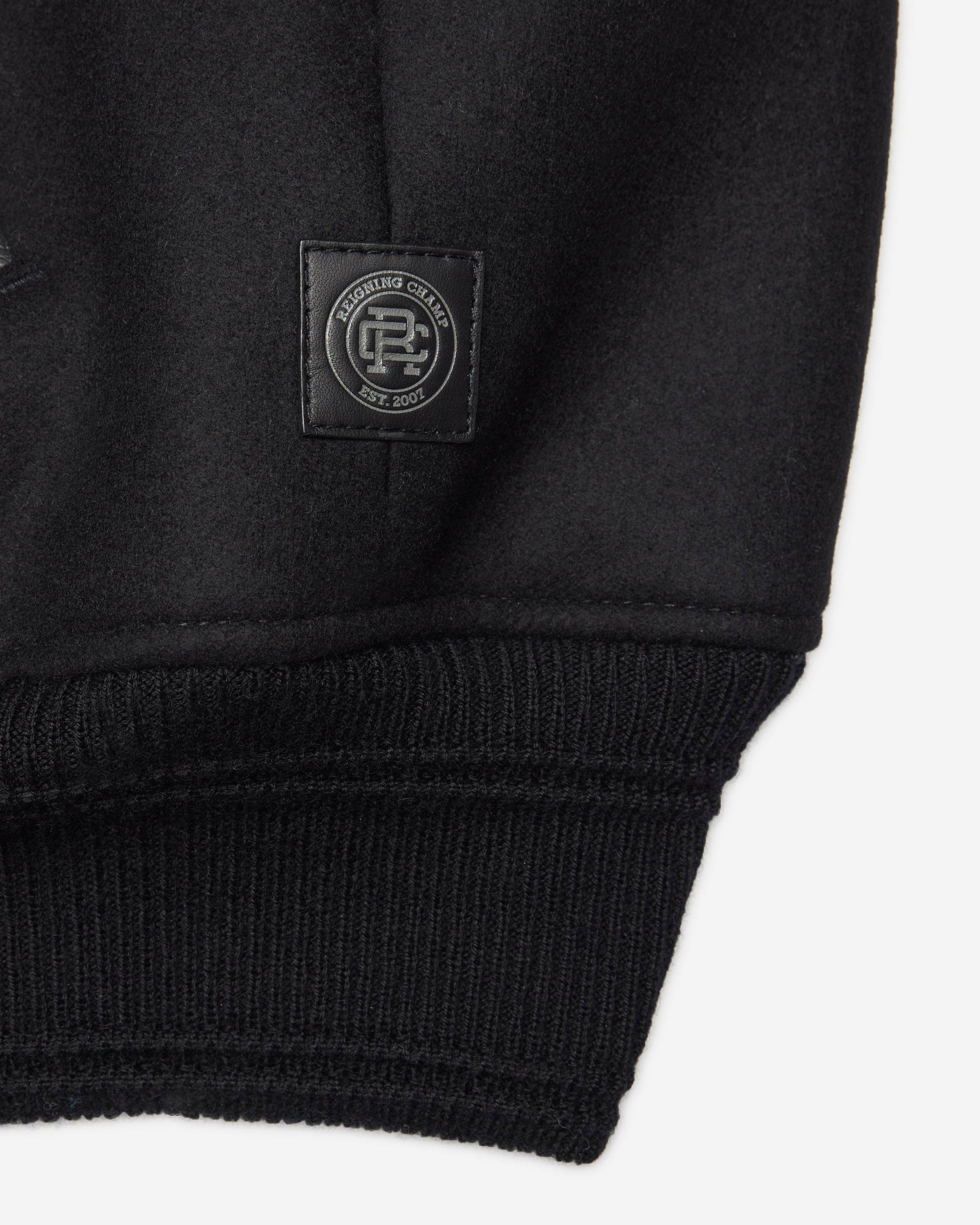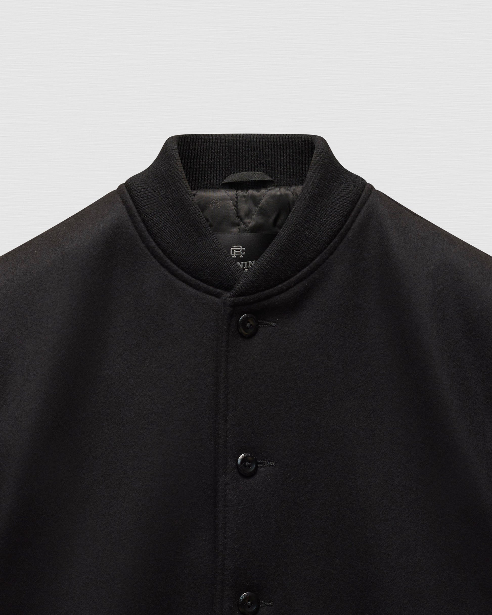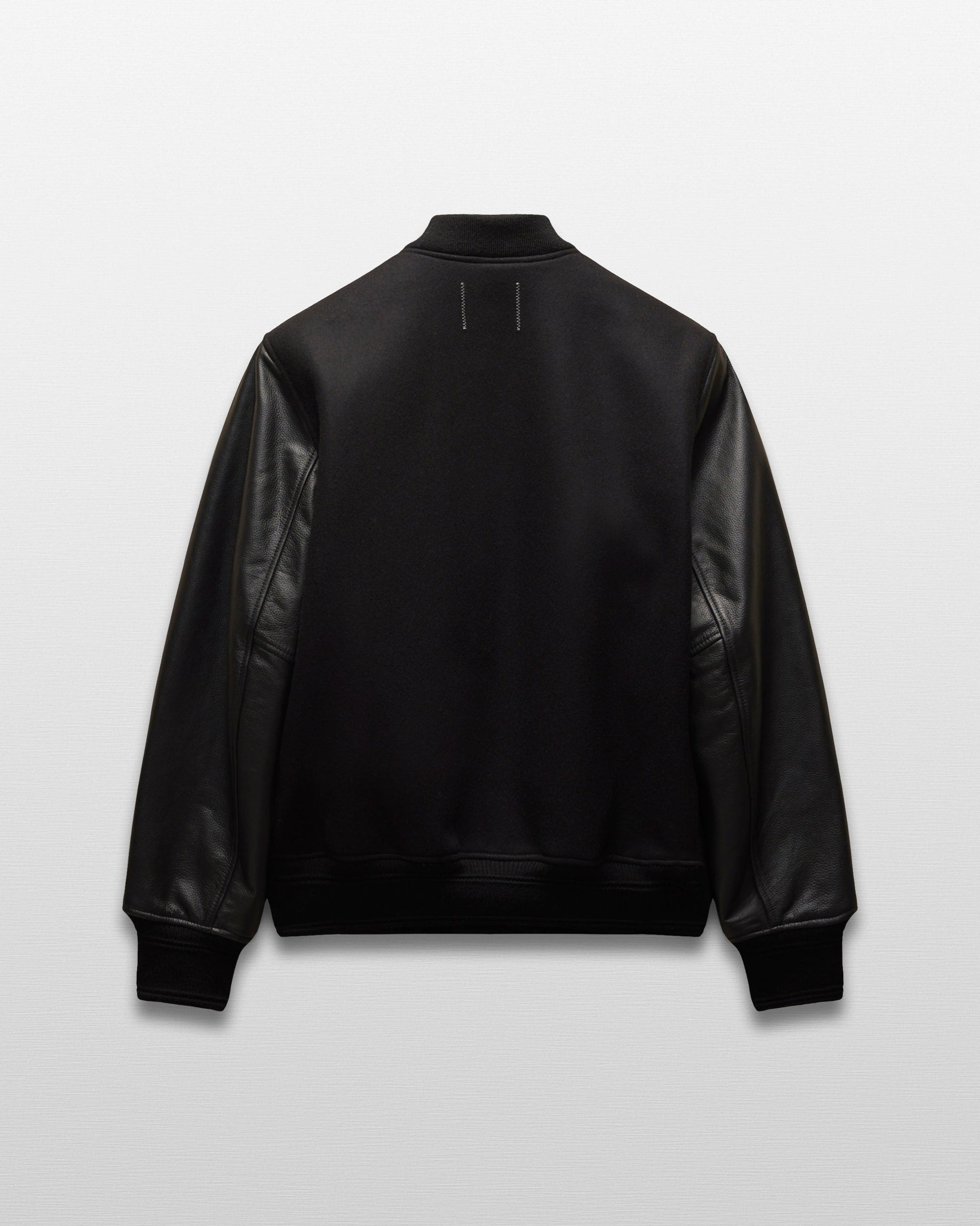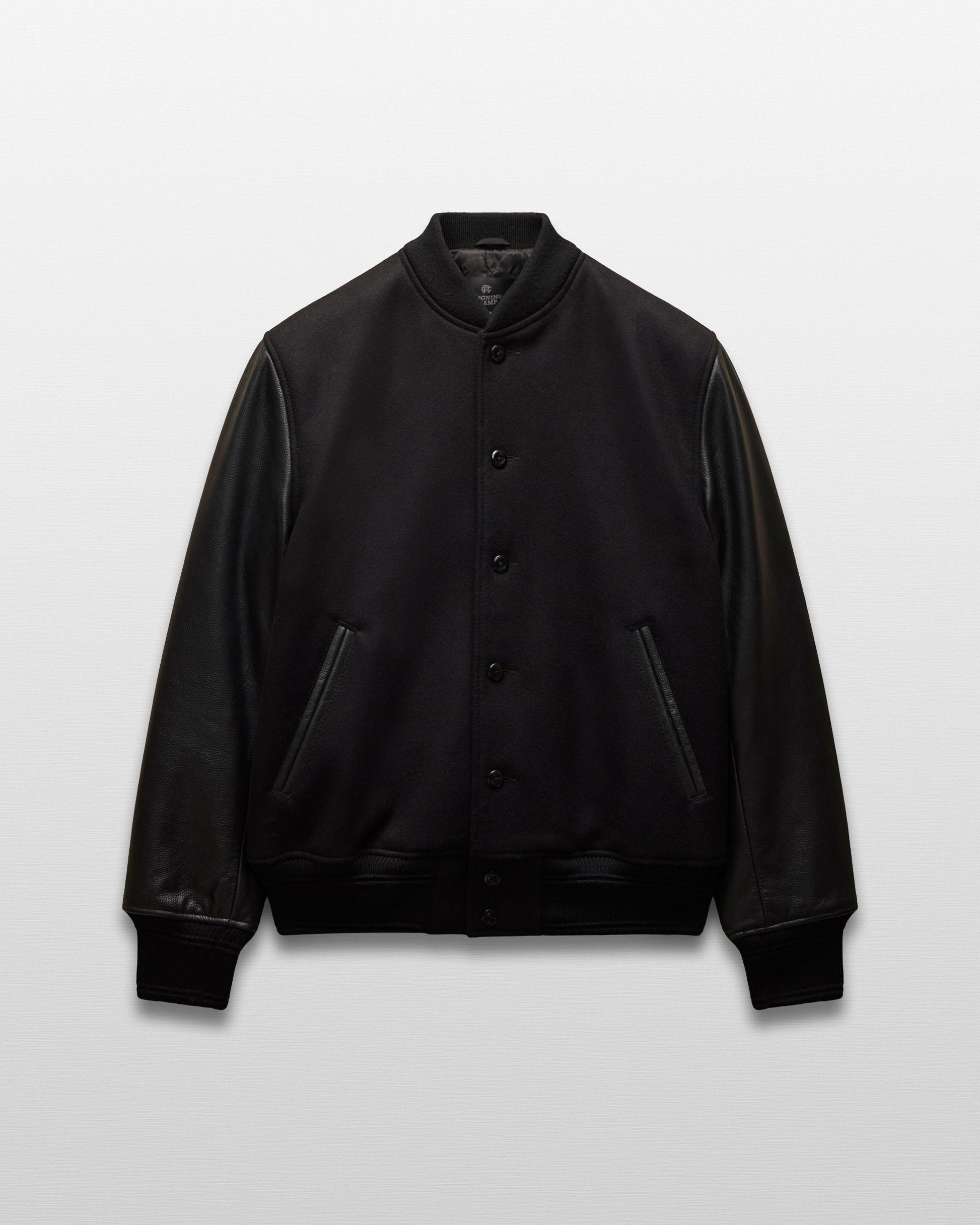 This varsity jacket is built with a combination of Italian wool cashmere and genuine leather. Featuring a generous standard fit for versatile layering, with viscose-lined sleeves and body. Designed with corozo button front closure, double welt slant pockets, an interior chest pocket, and premium rib collar, cuffs and hem.